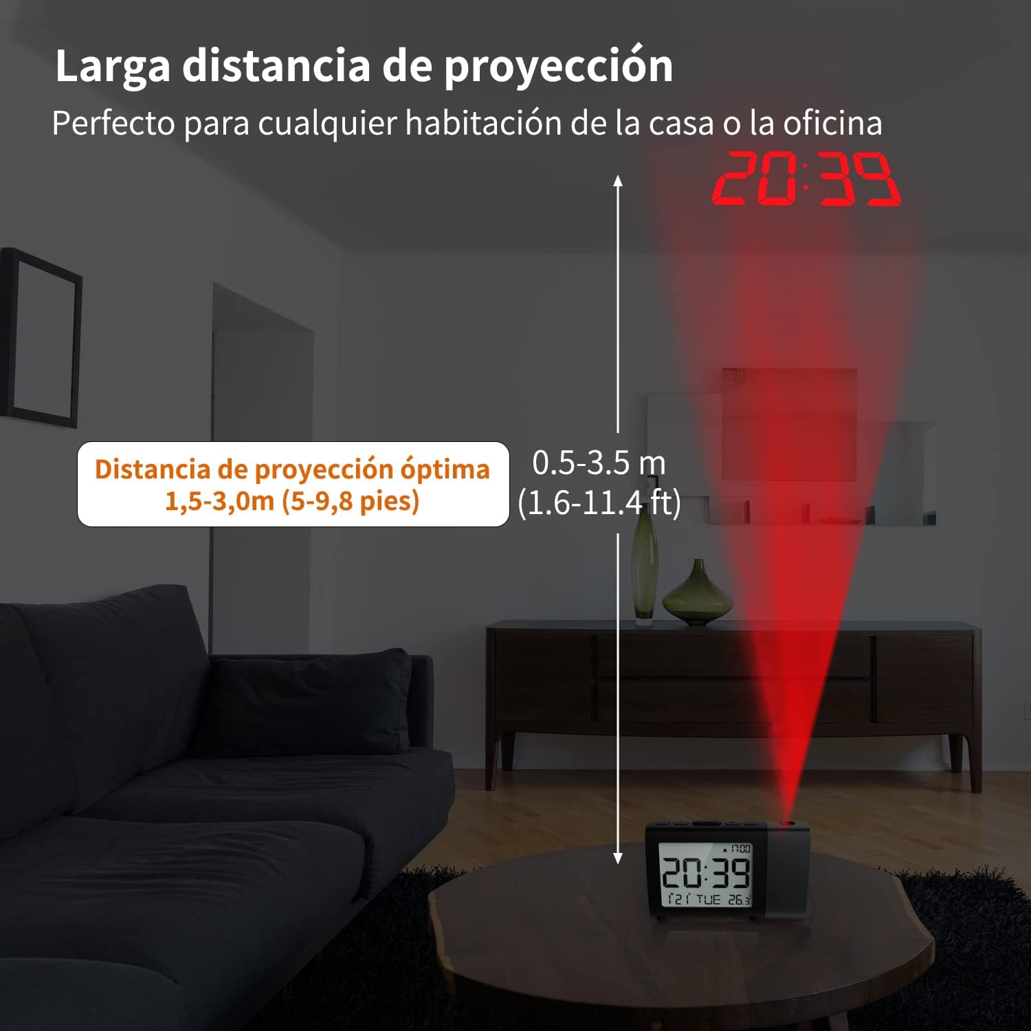 Es muy útil para ver la hora en posición tumbado de noche. La proyección en el techo es muy buena y de buen tamaño.Asemas de que es reloj oara el día también con pantalla muy luminosa.