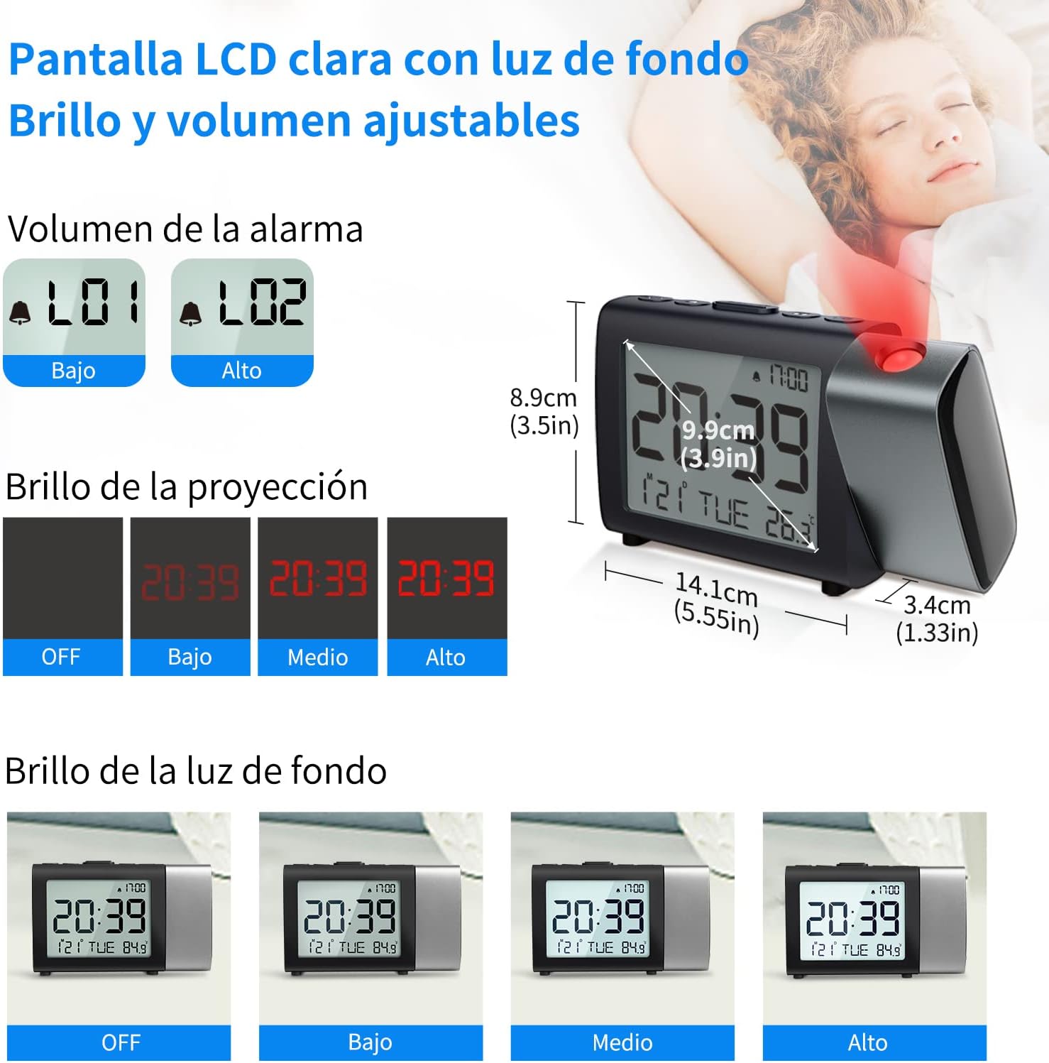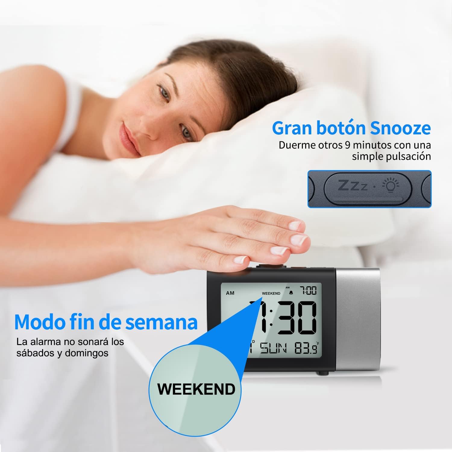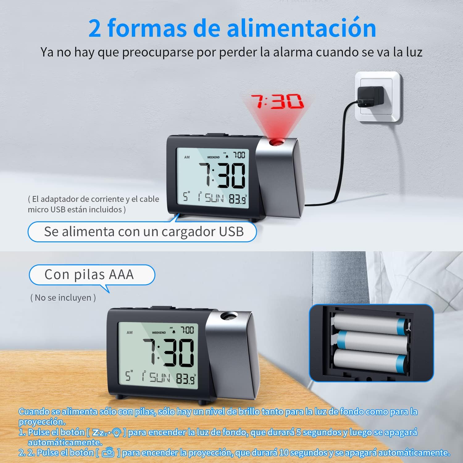 📌 Me hacía falta un despertador y me incliné por este modelo con pantalla LCD y proyector de luz en la pared/techo y con un tamaño compacto (13,8cm*3,5cm*8,5cm) 📌 Decir que estoy muy satisfecho con la adquisición, me parece muy muy fácil de utilizar, prácticamente se puede configurar sin las instrucciones. Con pocos botones, pero muy intuitivo. 📌 Me gusta el detalle que se vea la hora de la alarma en una esquina de la pantalla, en muchos relojes debes pulsar un botón para saberla. También nos indica la fecha, el día de la semana y la temperatura de la habitación donde está ubicado. 📌 Incorpora un modo “fin de semana” (weekend) que me ha parecido muy simpático, con solo pulsar un botón evitas que suene el despertador los sábados y domingos. 📌 Tiene una sola alarma, pero con dos tonos de intensidad : bajo (70dB) o alto (85dB). Muy correctos ambos y con botón de parada/repetición a los 9 minutos. 📌 La proyección es muy correcta, tiene 3 ajustes de intensidad 10%, 60% 100 % y modo apagado. 📌 También incorpora el giro de 180º de la proyección. 📌 Cuando la alimentación es con pilas, la luz permanece encendida durante 5 segundos al 100% de intensidad, en cambio cuando se alimenta con la fuente de alimentación la luz se puede elegir entre que se mantenga al 10%, 60%, 100 % de intensidad o modo apagado. 📌 Por poner una pega hay que decir que para mantener los ajustes necesita 3 pilas AAA, podría hacerlo con pila botón. 👏👏 Gracias por leer y calificar esta opinión, espero que sea útil.