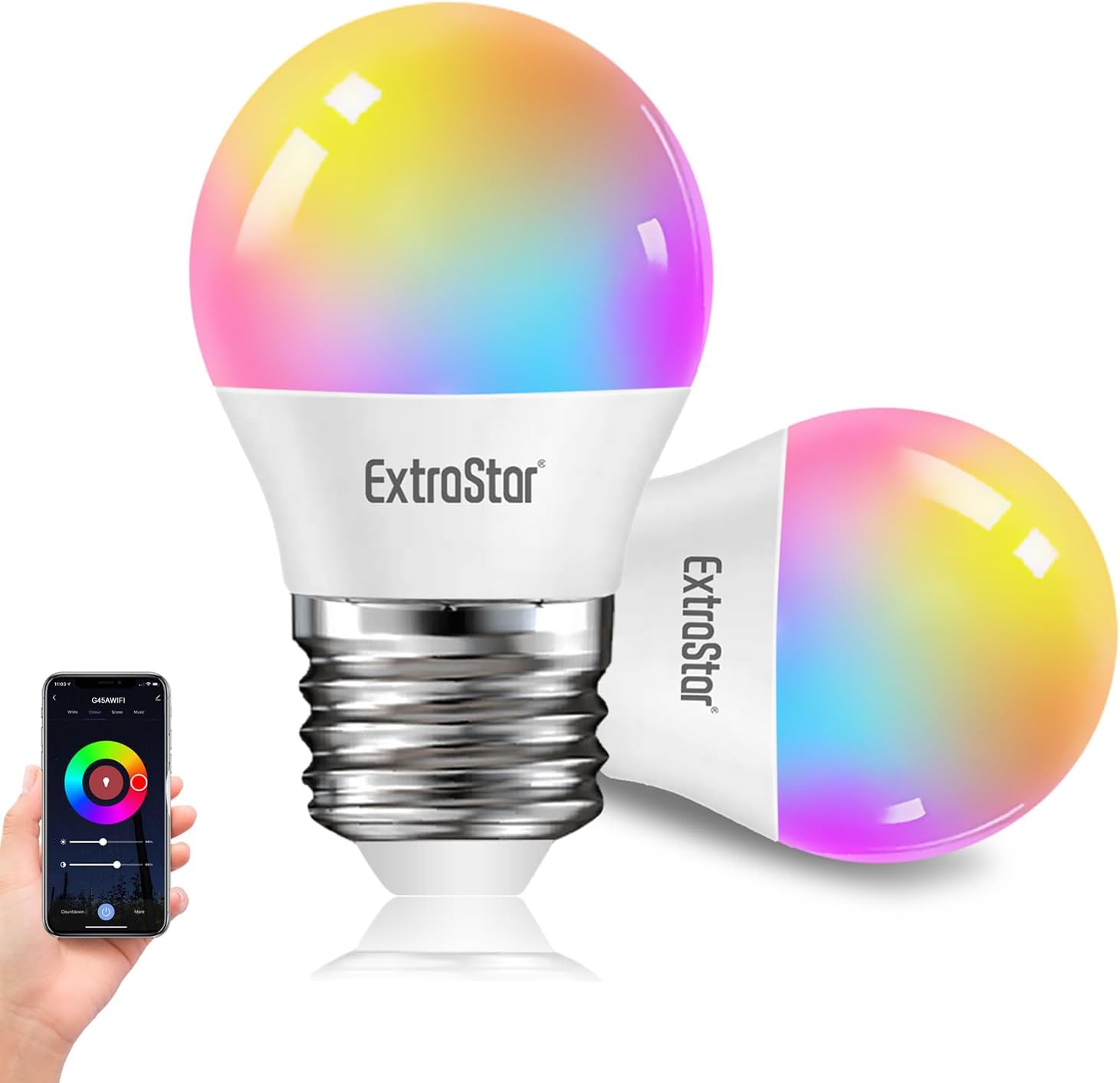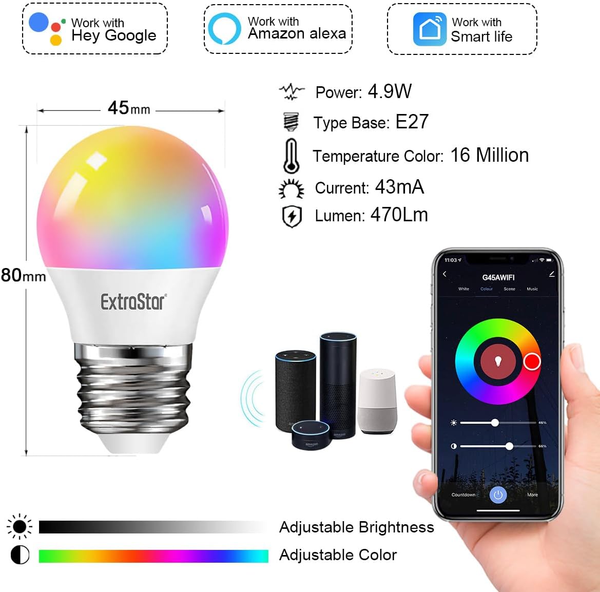 EXTRASTAR G45 E27 RGBW WiFi Smart Bulb Easy Installation Easy to install on all E27 base lamps. Thanks to the SmartHome app and WiFi connection, you can control brightness, color, turn on and off easily. Change colors to the rhythm of music This A60 smart LED bulb includes a music rhythm function that syncs color changes with music, making your parties more dynamic and fun. Schedule Function Set the light to turn on in the morning and wake you up with soft lighting. You can also schedule a gradual shutdown at night, avoiding worrying about leaving the lights on. Wide Application Ideal for indoor lighting in homes, hotels, restaurants, bars, cafes, parties and more. Technical details: Voltage: 220-240V~ Power: 4.9W Socket: E27 Colour temperature: CCT + RGB Life: 25,000 hours