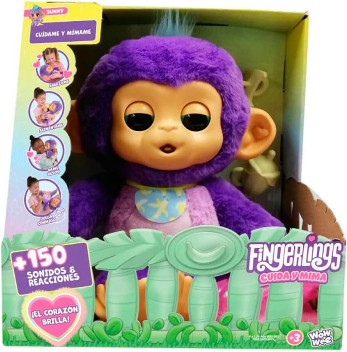 Care n’ Cuddles Interactive Baby Monkey or Fingerlings Interactive Care and Pamper cutie is the cutest friend little ones can care for. Sunny is an adorable purple baby monkey with soft fur, cuddly body and heart that lights up in a rainbow of colors. With over 150 sounds and reactions, kids can feed their monkey baby with their bottle, rock him to sleep, give him a kiss, flip it, swing him and more. When it’s time to sleep, the night light mode reassures children. Includes 4 fun games and 4 accessories: a bottle, a pacifier, a bib, and a rattle Care n’ Cuddles Interactive Monkey Baby is the perfect companion for your little one and loves being pampered!