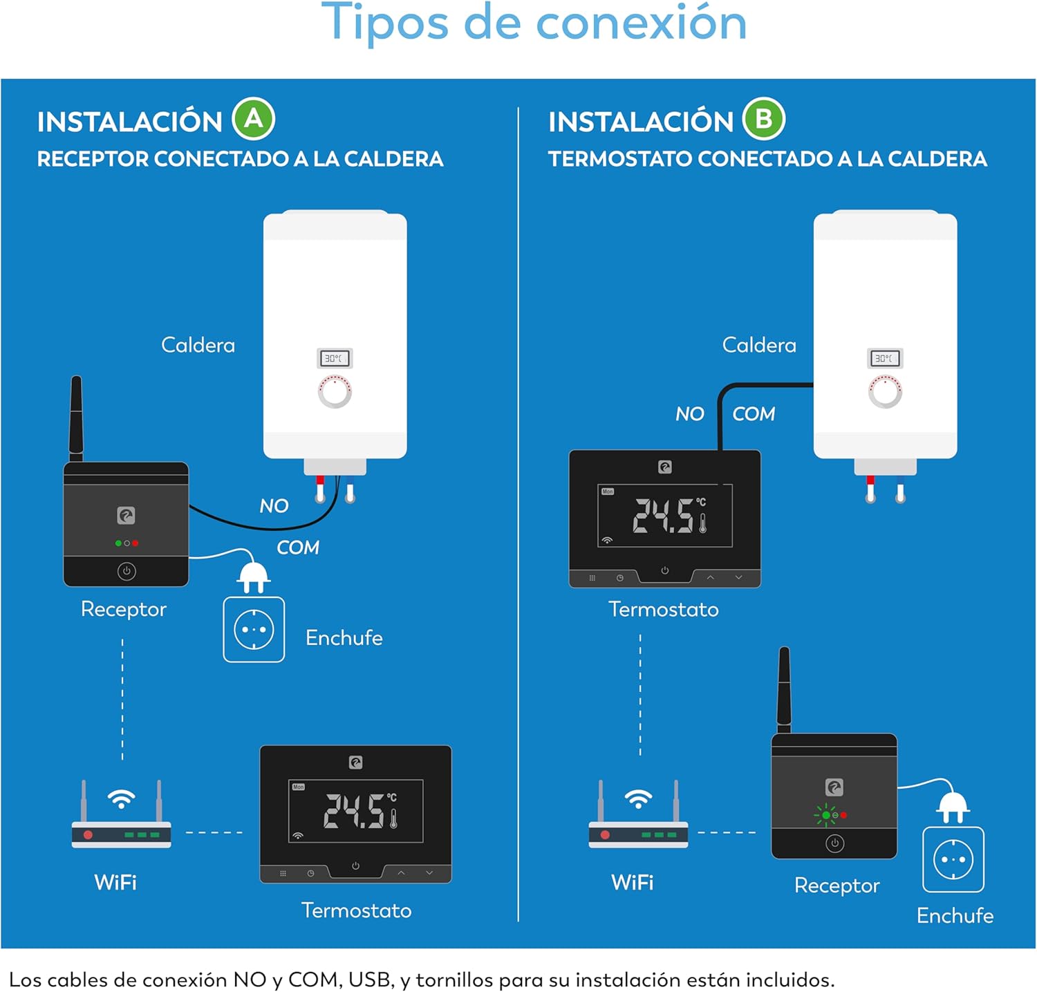 Excelente producto a muy buen precio (57 €), compra recomendable 100%. Fácil de instalar. La unidad receptora y la unidad emisora vienen vinculadas de fábrica. Los cables de corriente y los de com y no ya vienen conectados en la unidad receptora de fábrica. En mi caso he conectado la unidad receptora mediante los cables com y no a mi caldera Ariston Clas One (yo tenÃa colocado un cronotermostato de Ariston conectado en la conexión bus en la placa de la caldera), lo que hay que hacer es sacar los cables de la conexión bus y ponerlos en TA1 como se puede ver en las fotos que he colgado, el resto se deja como está (en otras calderas lo normal es que venga señalizados com y no para conectar la unidad receptora). He optado por esta instalación para asà poder mover la unidad emisora (la que tiene la pantalla táctil) a cualquier estancia de la casa. Tras la instalación tienes que descargar la App de Garza e ir siguiendo los pasos que te va pidiendo. Cuando hayas terminado con la configuración de la App ES IMPORTANTE pulsar brevemente (1 segundo) el botón de la unidad receptora hasta que te aparecen las luces azul y roja, ambas fijas al mismo tiempo (en mi caso me parpadeaba la luz verde, azul o solo me aparecÃa la luz verde y aunque la aplicación funcionaba y mandaba la orden al emisor, la caldera no se conectaba, me volvà loco pensando qué habÃa hecho mal, y era tan simple como pulsar el botón de la unidad receptora hasta que aparece la luz azul y roja al mismo tiempo). La aplicación funciona perfectamente y es muy intuitiva, desde la misma puedes vincular el cronotermostato con Alexa para asà poder darle órdenes de voz. Hay un pequeño tutorial en YouTube de la propia casa Garza que dura 4 minutos y 25 segundos y te guÃa bastante bien.Tengo que probar más productos de Garza porque he quedado encantado con este cronotermostato wifi Etna.