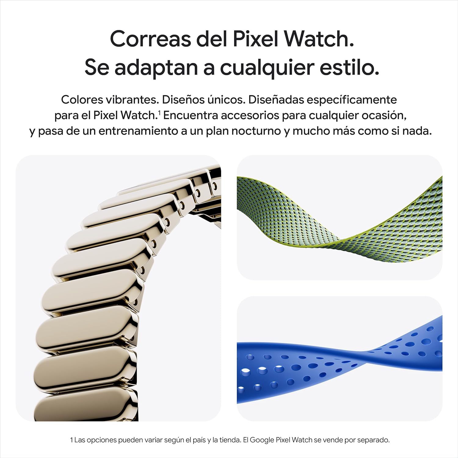 El texto dice «Correas del Pixel Watch, Colores vibrantes, Estados Unidos». Se muestran varias correas de reloj en diferentes estilos y materiales, incluidos patrones tejidos y perforados en varios colores.