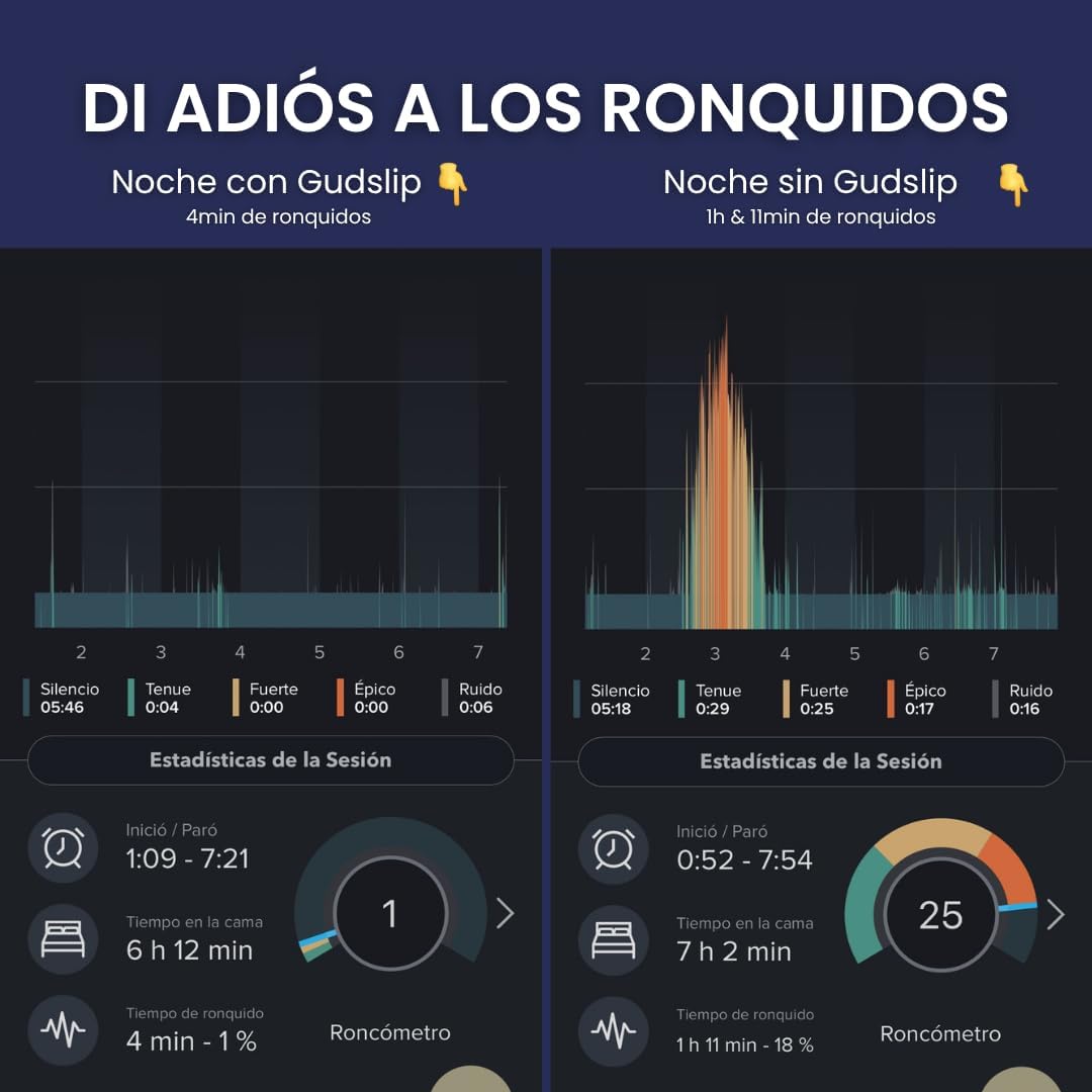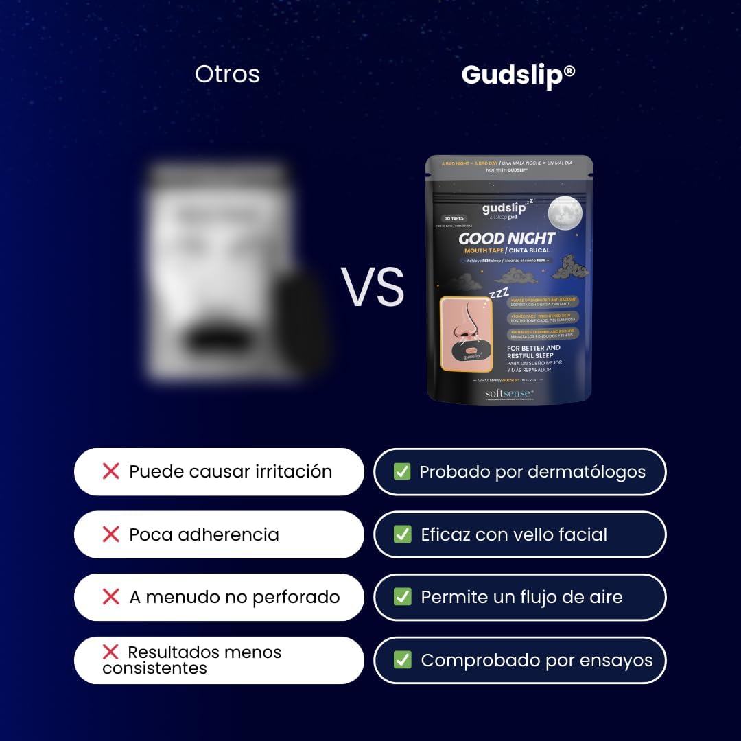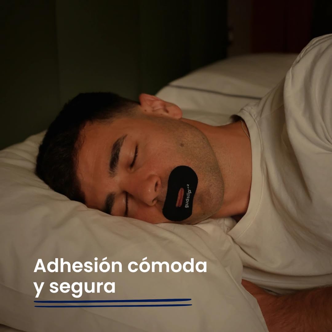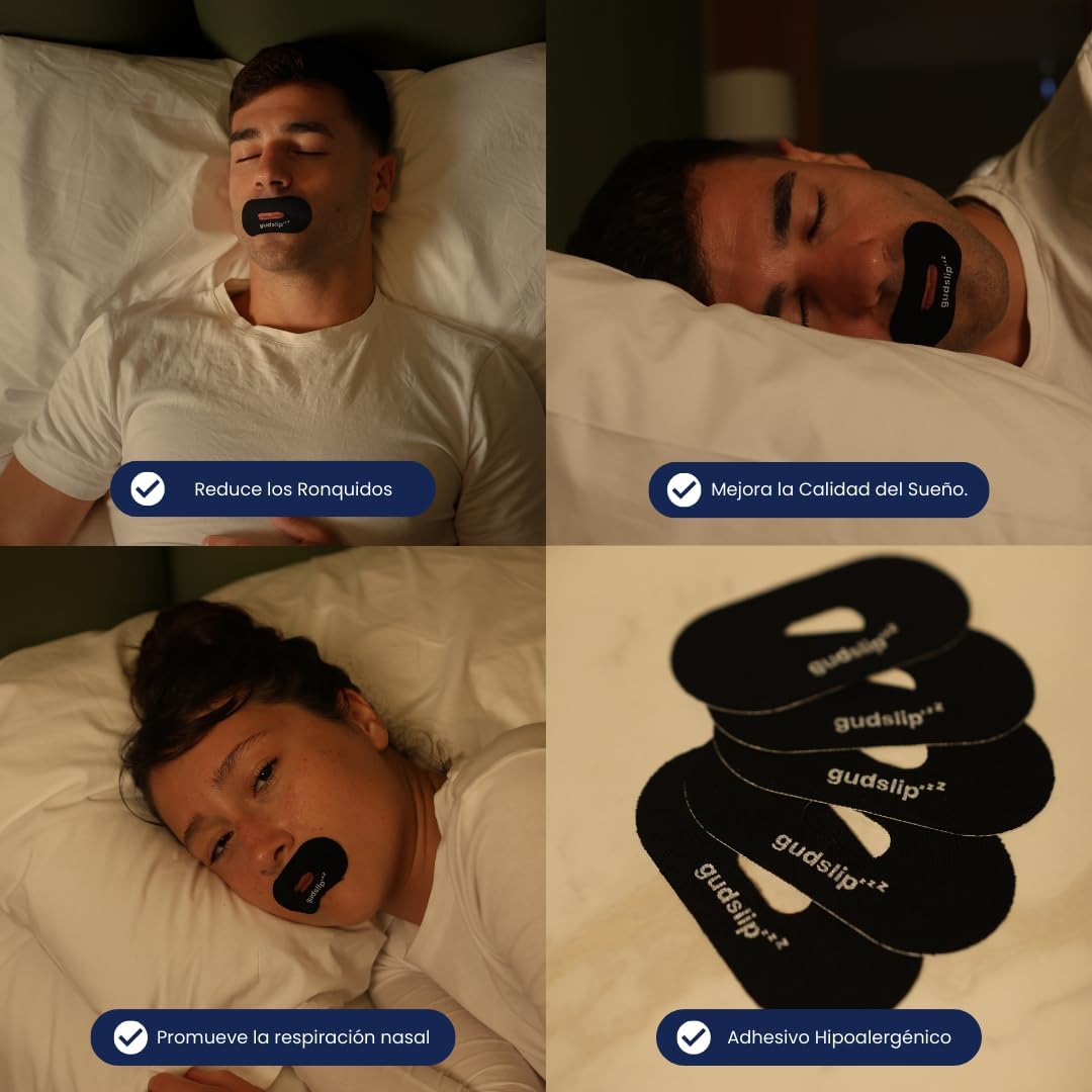Experimenta un sueño sin esfuerzo con nuestra cinta bucal Gudslip. Diseñado para promover la respiración por la nariz, te ayudará a conciliar el sueño más rápido y a permanecer dormido durante la noche evitando la respiración por la boca y los ronquidos. Este simple cambio garantiza un descanso más profundo y respalda ciclos REM extendidos para una mañana verdaderamente rejuvenecida.