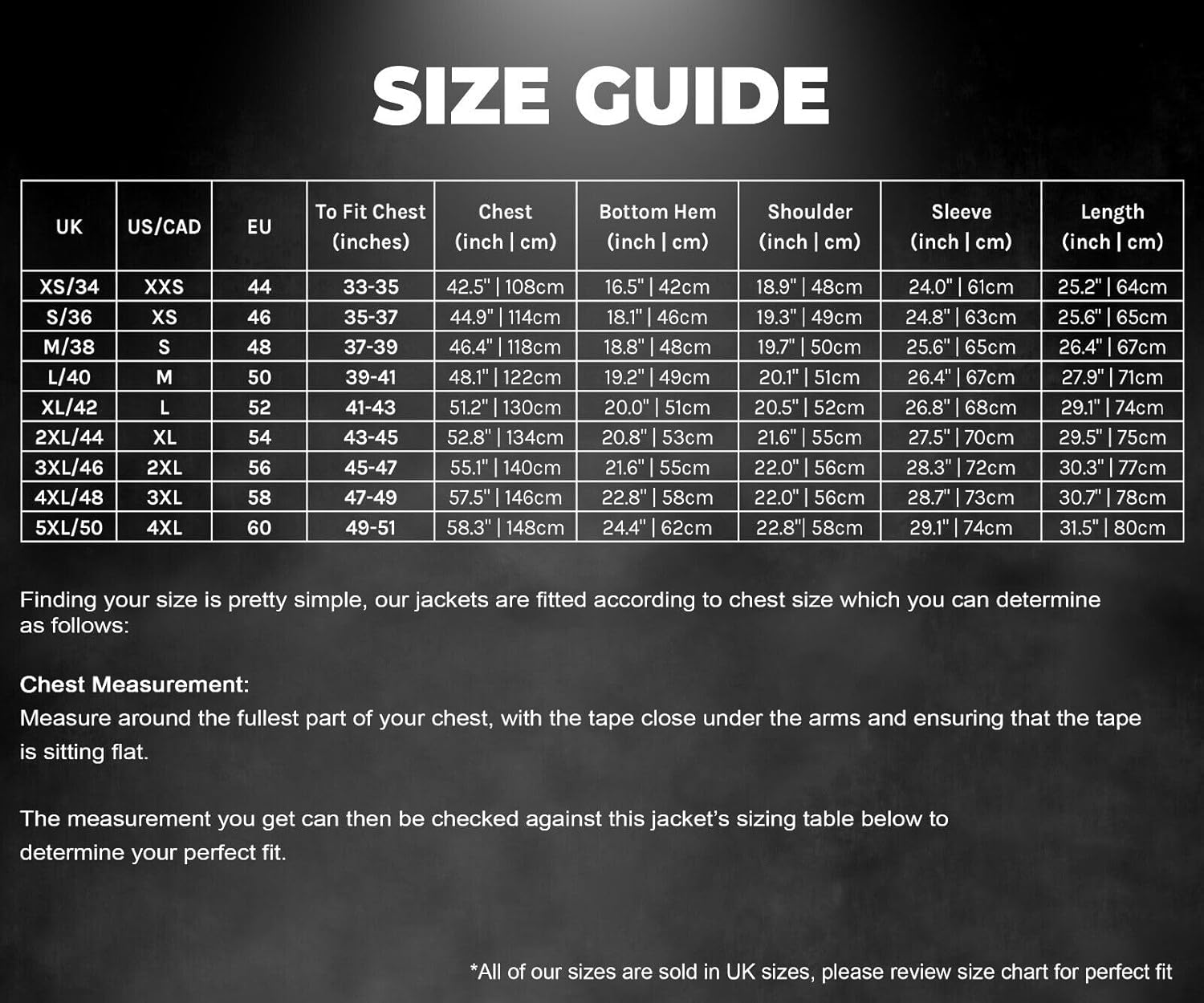 I read one customer review and they said they bought 1size bigger, so normally I buy 2XL so I went for 3XL because I can’t be bothered to send things back and when the jacket came it fitted me just how I like it, not to tight not to big,perfect. The quality of the jacket was great and for that price even better. I will definitely buy another one that’s for sure just wish they had even more colours to choose from. As for the delivery 1st class.