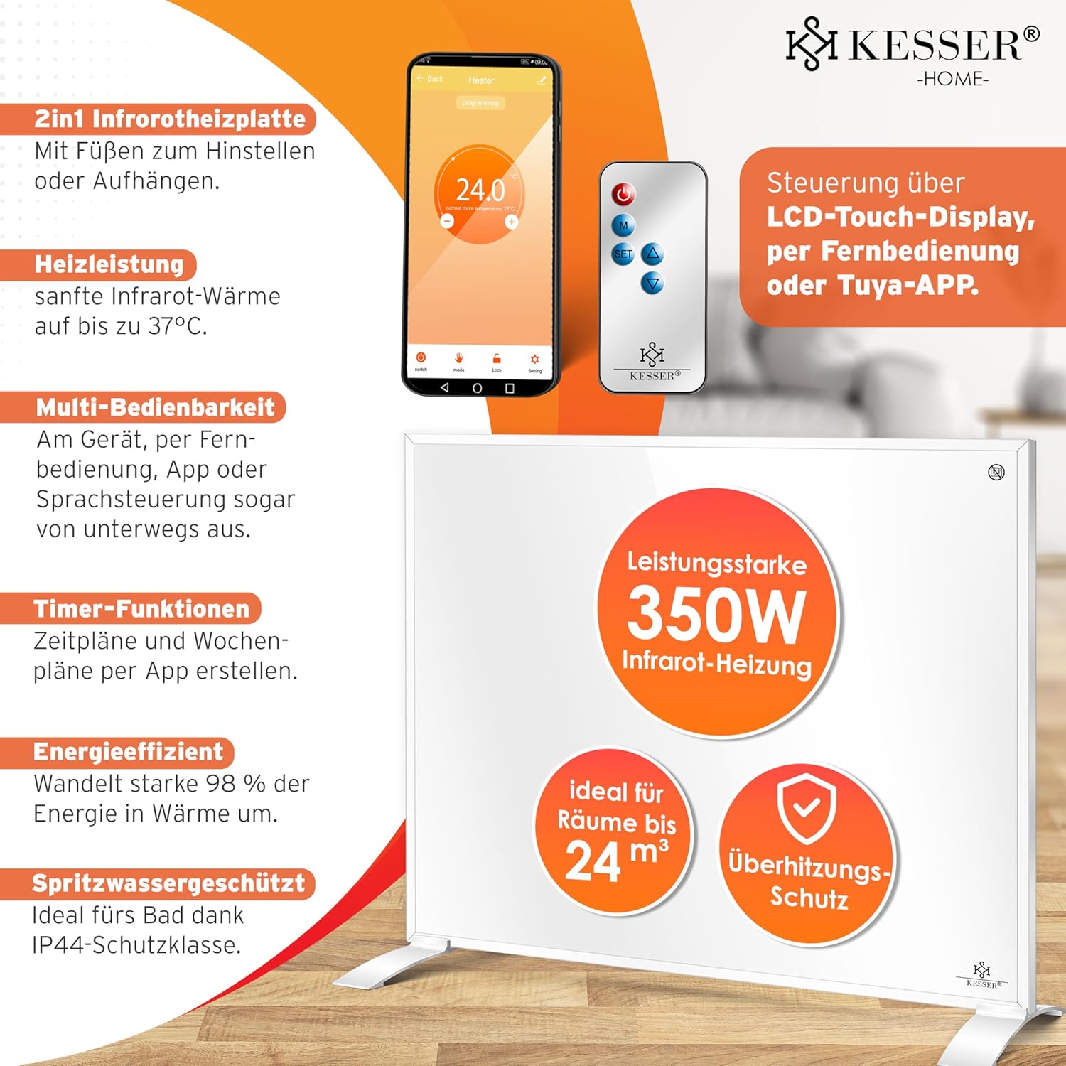 KESSER Energy-saving infrared heating, independent infrared device and wall mounted, 350W electric heating with remote control, thermostat and control by