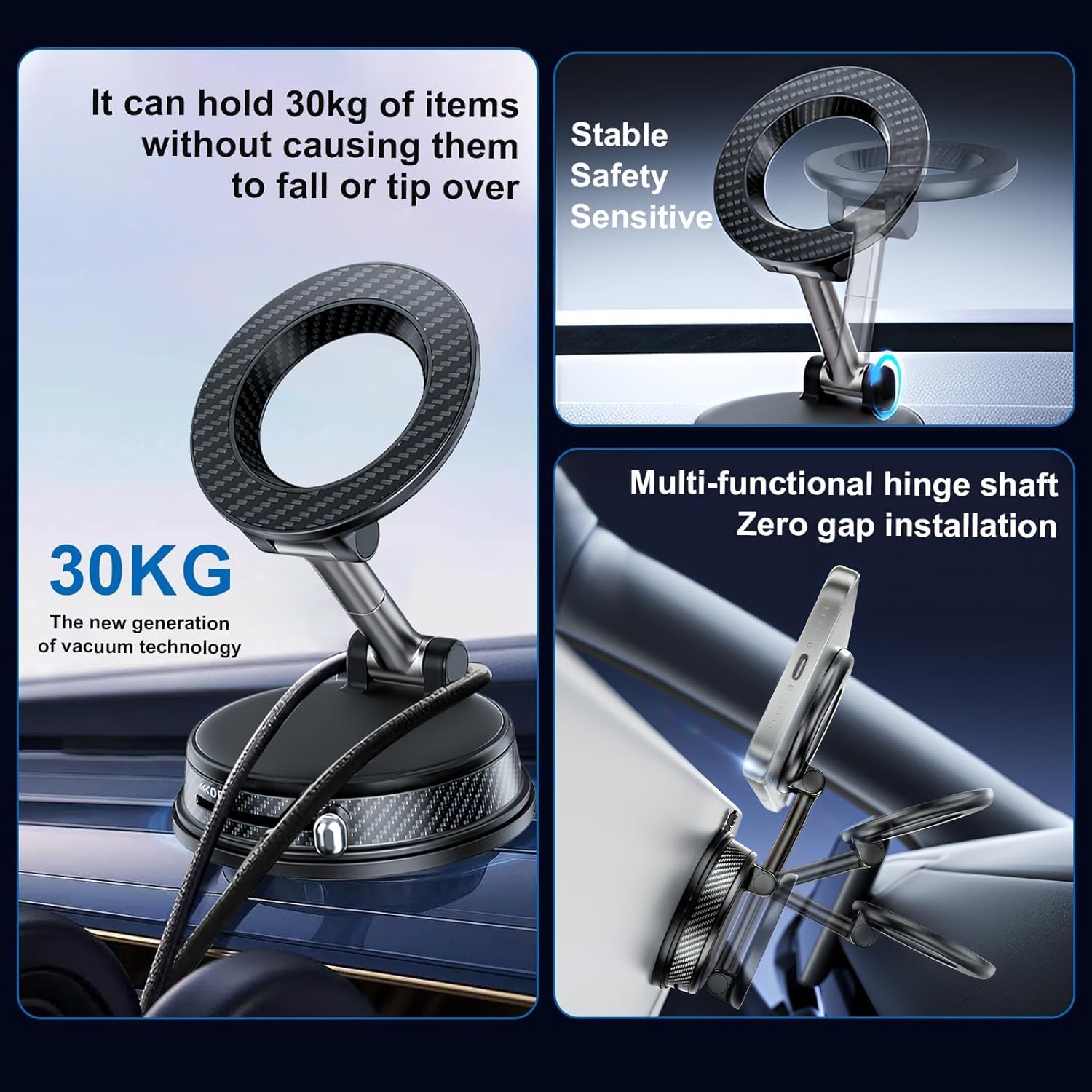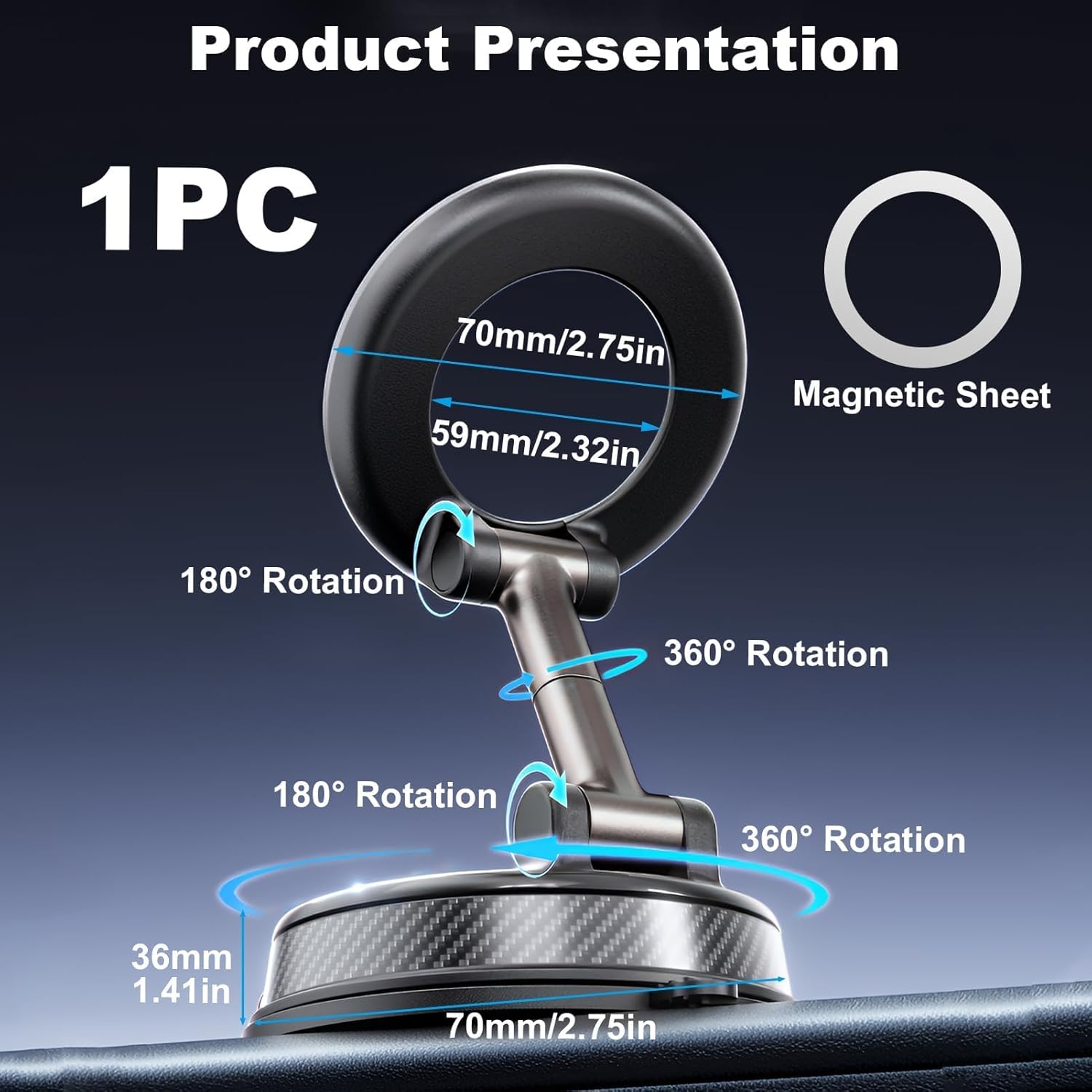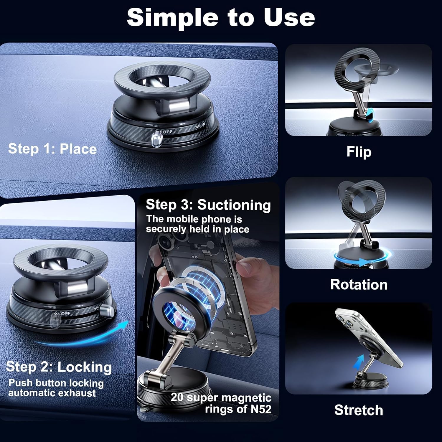 Material: Made of premium ABS, a durable metal adjustment arm, grade N52 neodymium magnets and a silicone-reinforced vacuum suction cup.