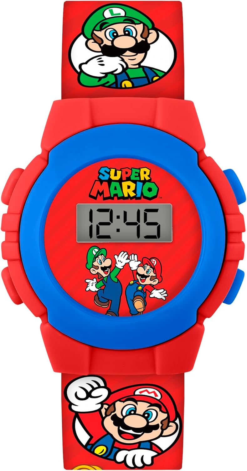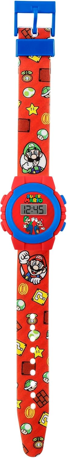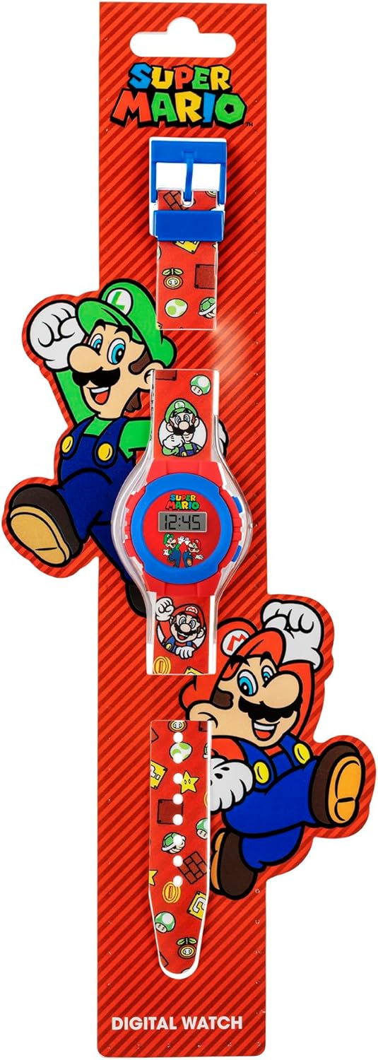 Super Mario Red digital watch. Featuring an Super Mario themed printed strap with traditional buckle closure, round plastic case with fun character dial and digital time display. Packaged in an official branded gift box and comes with one year warranty.