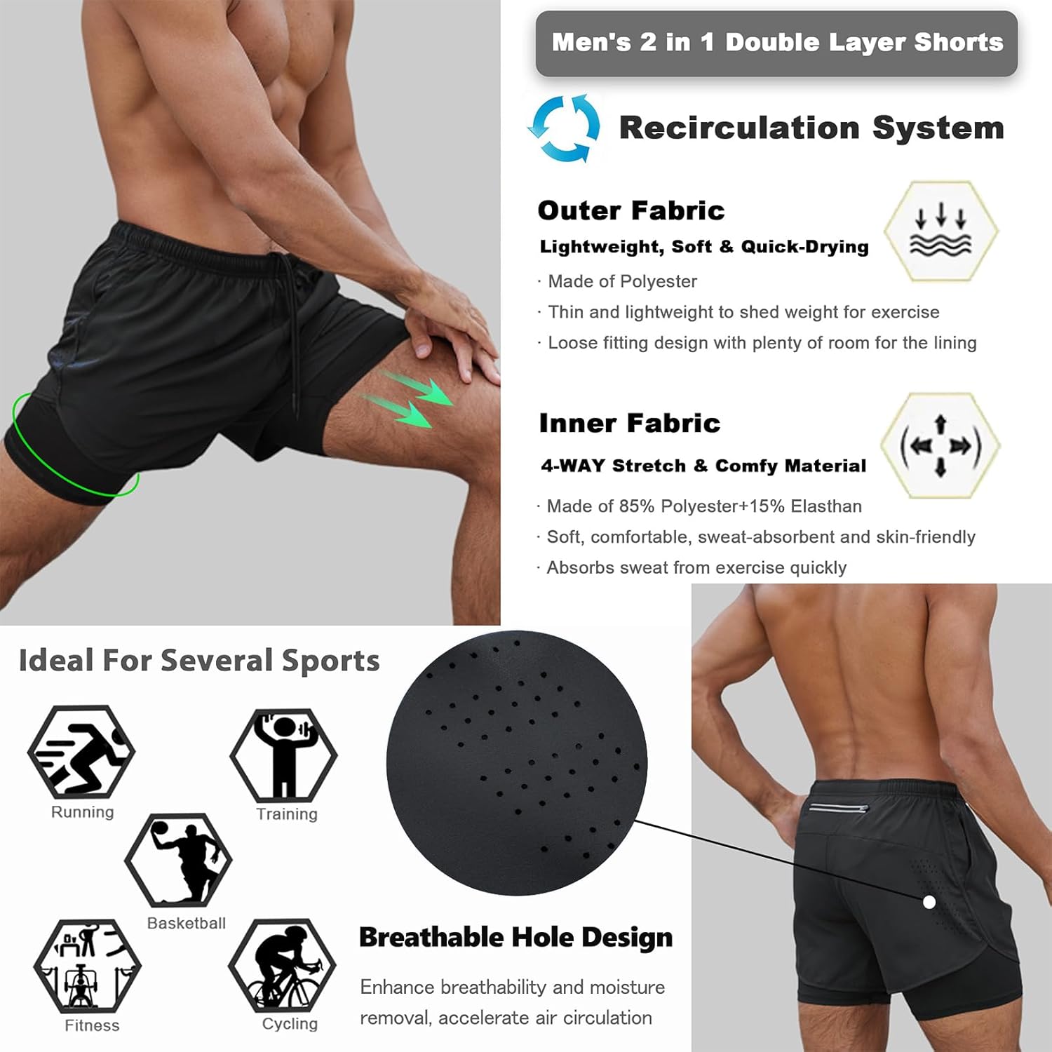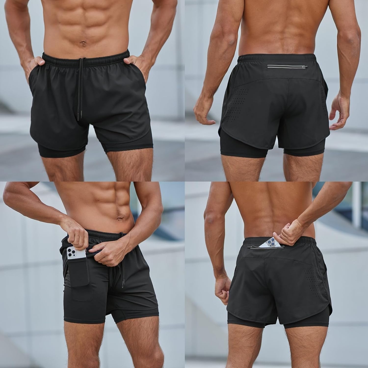 Pantalones cortos de hombre 2 en 1 son una buena opción para el trabajo diario de hombres atléticos haciendo ejercicio: voleibol de playa, levantamiento de pesas, correr y ejercicios en el gimnasio. Muestra la versatilidad de los pantalones cortos deportivos grises para diversas actividades físicasde hombres atléticos haciendo ejercicio: voleibol de playa, levantamiento de pesas, correr y ejercicios en el gimnasio. Muestra la versatilidad de los pantalones cortos deportivos grises para diversas actividades físicas