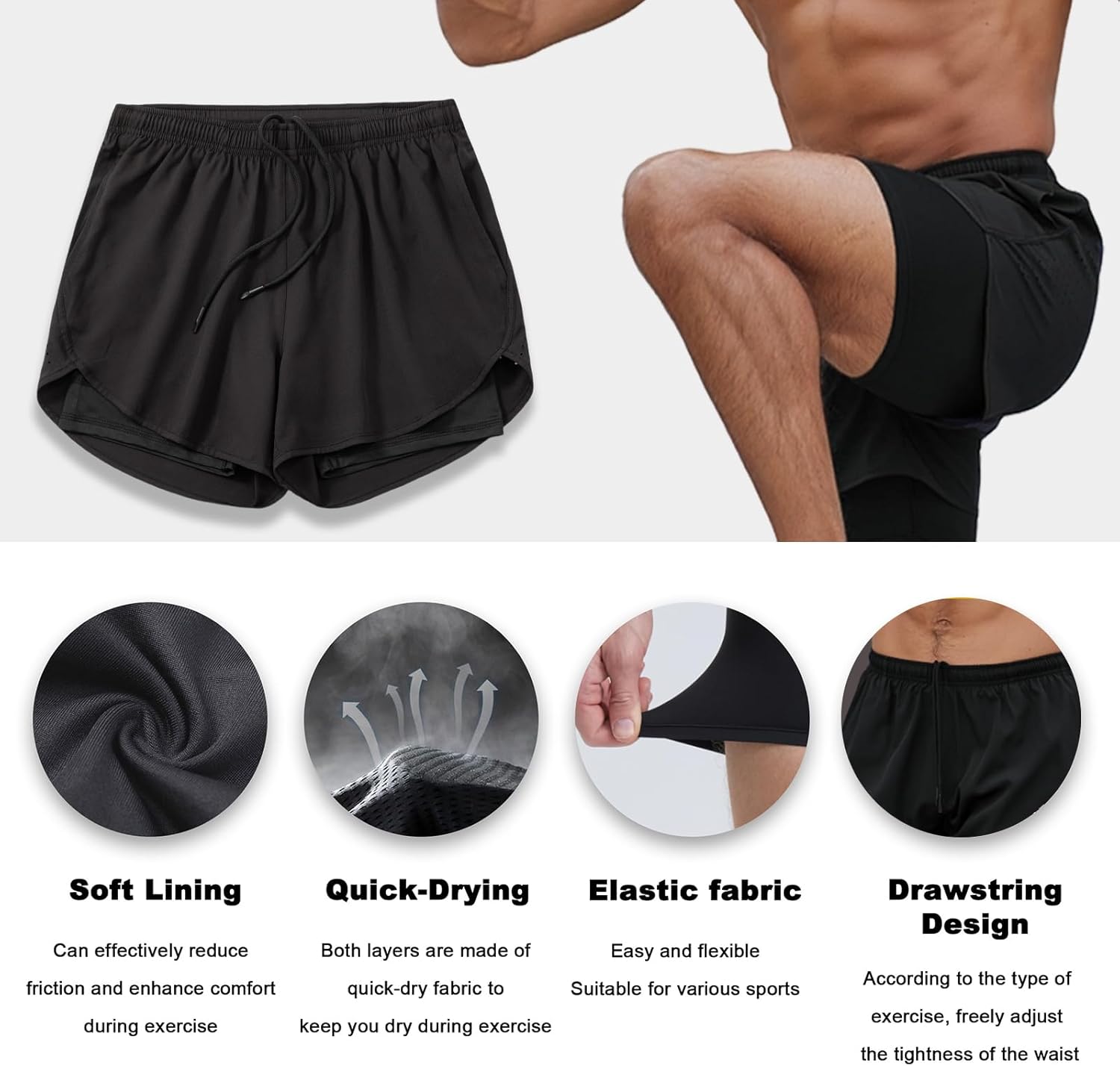 Smatstyle pantalon corto hombre deporte 2 en 1 con Bolsillo secado rápido para hombre con forro interior. Tejido ligero y de secado rápido. Cintura elástica con cordón. Se muestra en el torso atlético de un hombre enpara hombre con forro interior. Tejido ligero y de secado rápido. Cintura elástica con cordón. Se muestra en el torso atlético de un hombre en