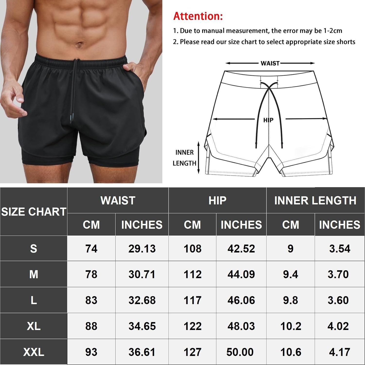 Quick-dry uomo sport running shorts tamaño información para pantalones cortos deportivos que muestra las medidas de cintura, cadera y longitud interior en centímetros y pulgadas para las tallas S a XXL. Incluye un diagrama de pantalones cortos con puntos de mediciónpara pantalones cortos deportivos que muestra las medidas de cintura, cadera y longitud interior en centímetros y pulgadas para las tallas S a XXL. Incluye un diagrama de pantalones cortos con puntos de medición