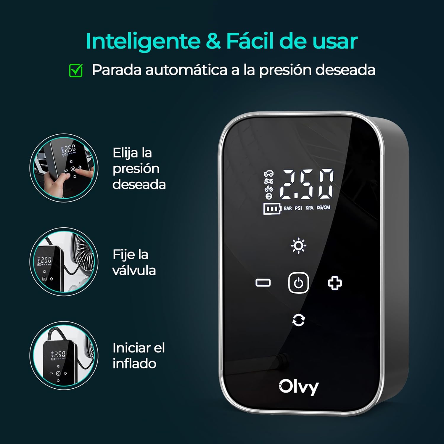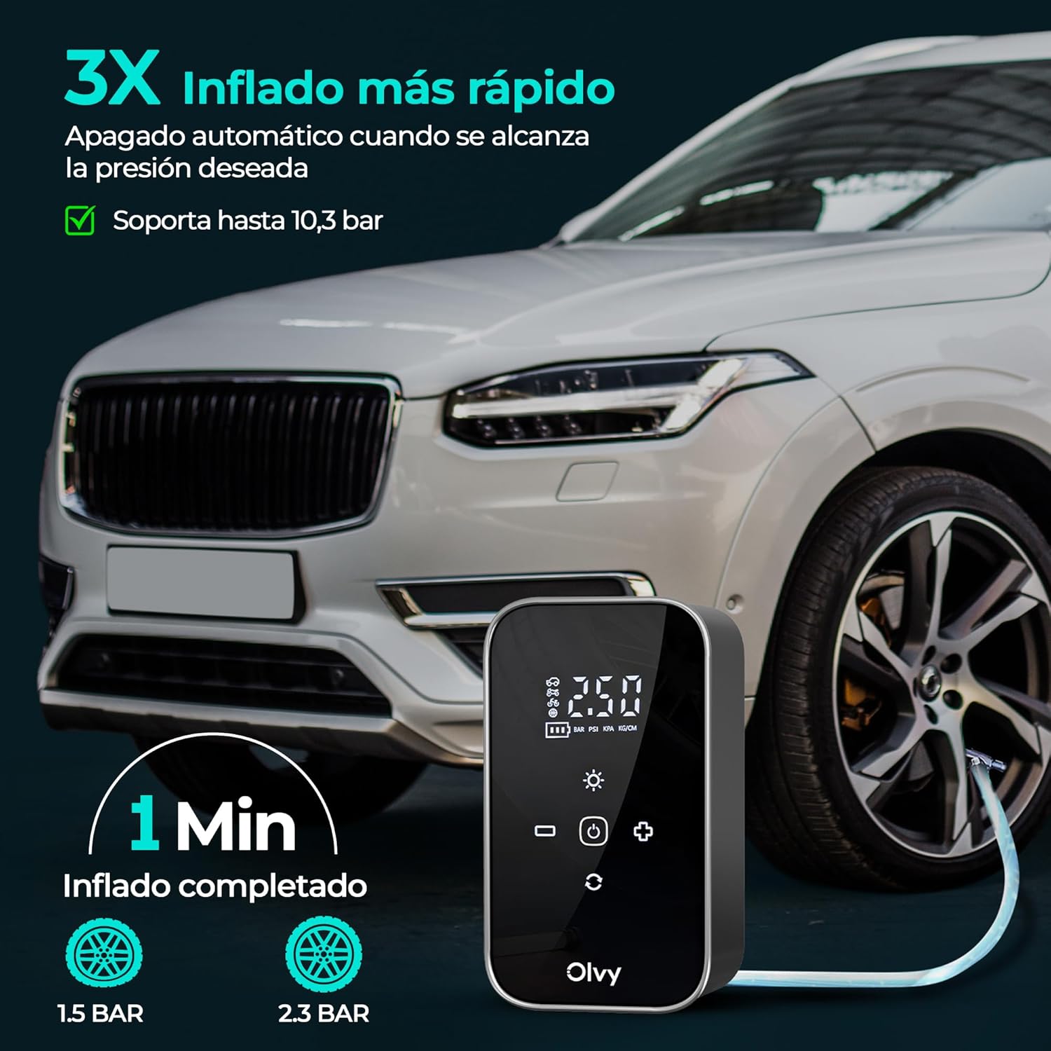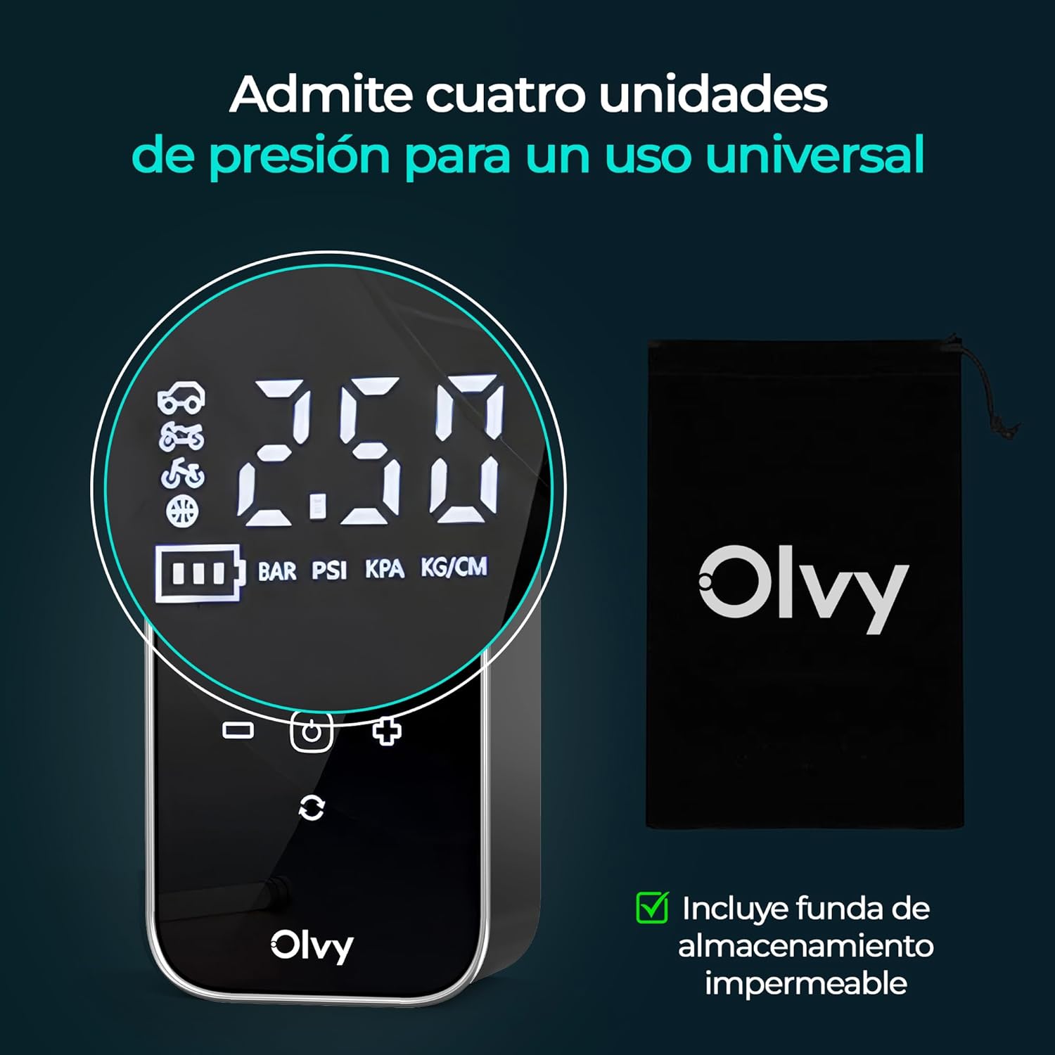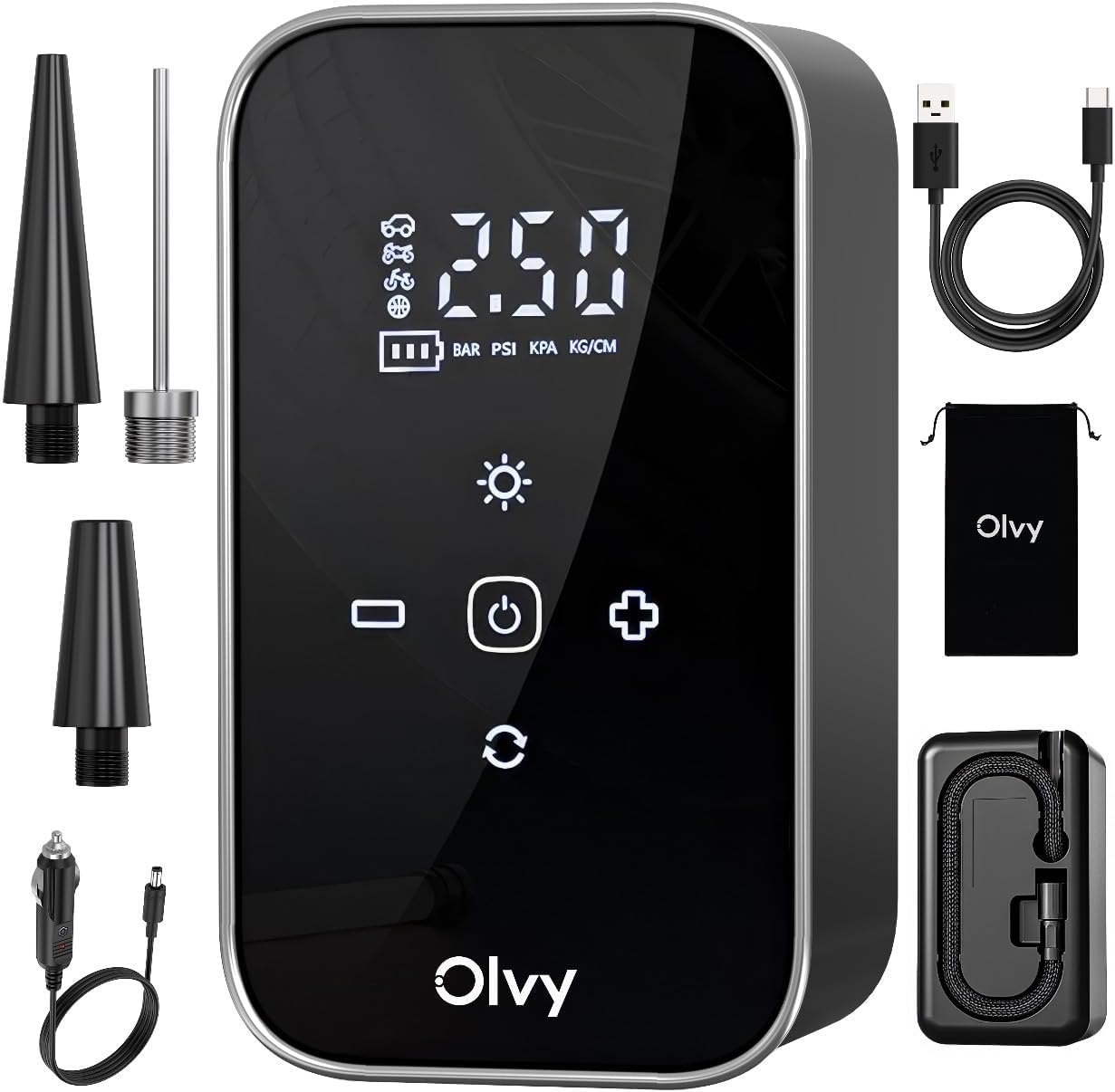 Olvy Portable Air Compressor – Cordless Tire Inflator 12 V – Rechargeable Battery 6000 mAh – Digital Display – Auto Shut Off – LED Light – for Car, Bike, Motorcycle, Ball and Mattress