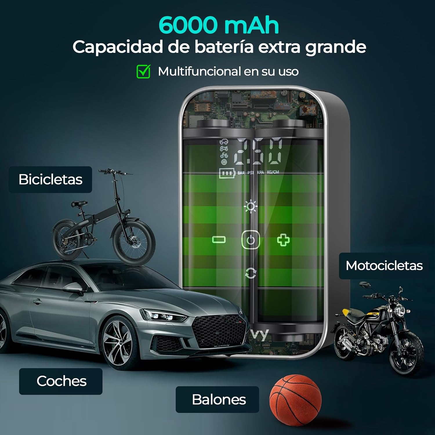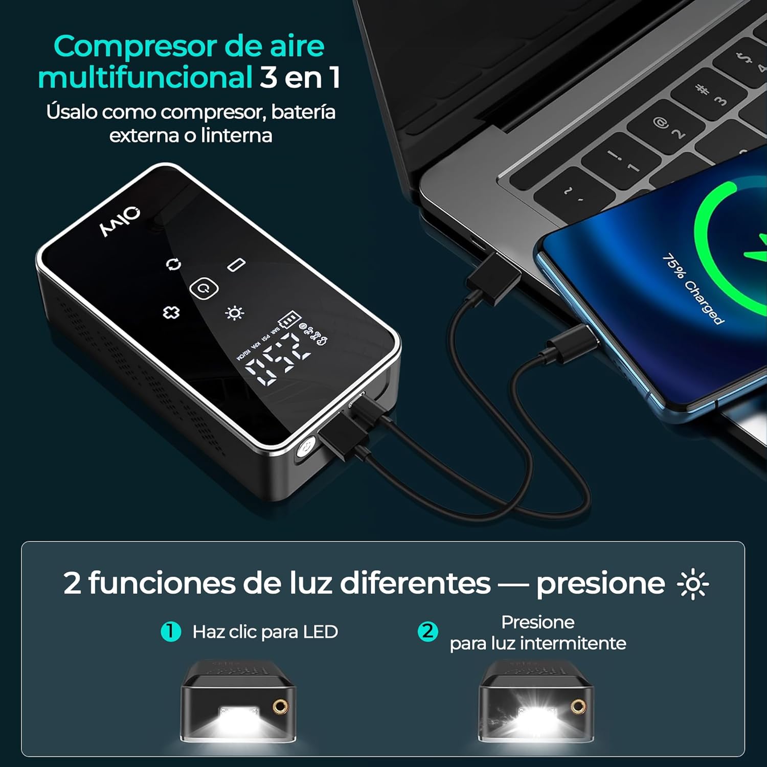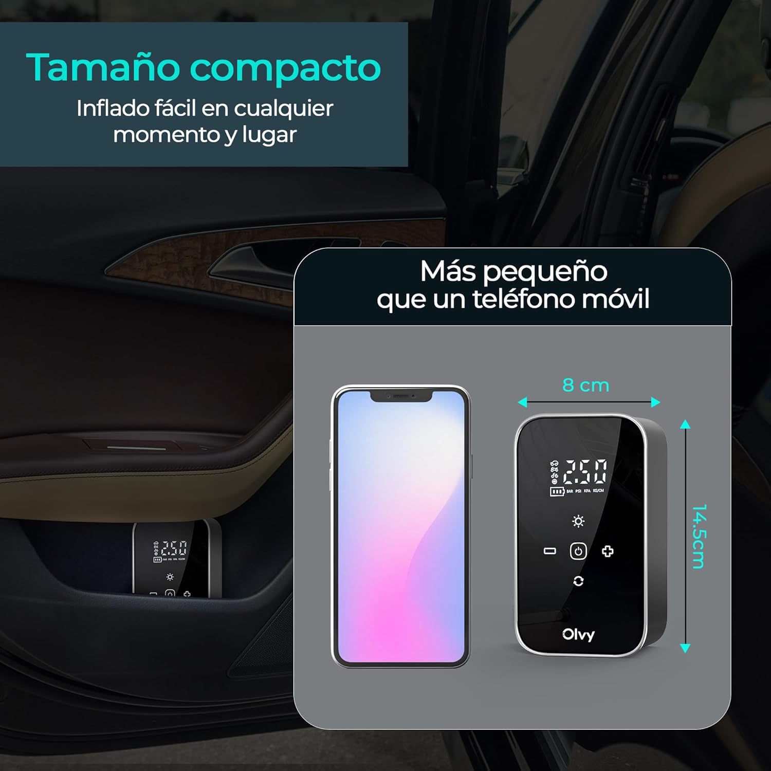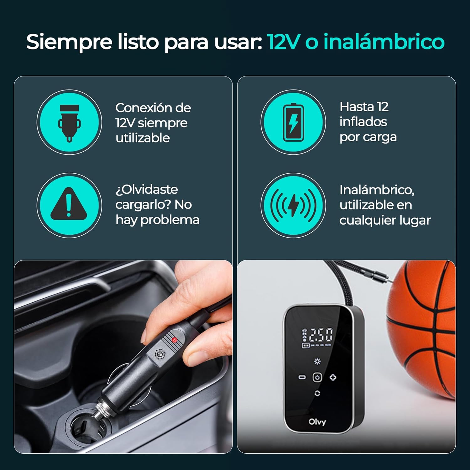 Olvy Portable Air Compressor – Cordless Tire Inflator 12 V – Rechargeable Battery 6000 mAh – Digital Display – Auto Shut Off – LED Light – for Car, Bike, Motorcycle, Ball and Mattress