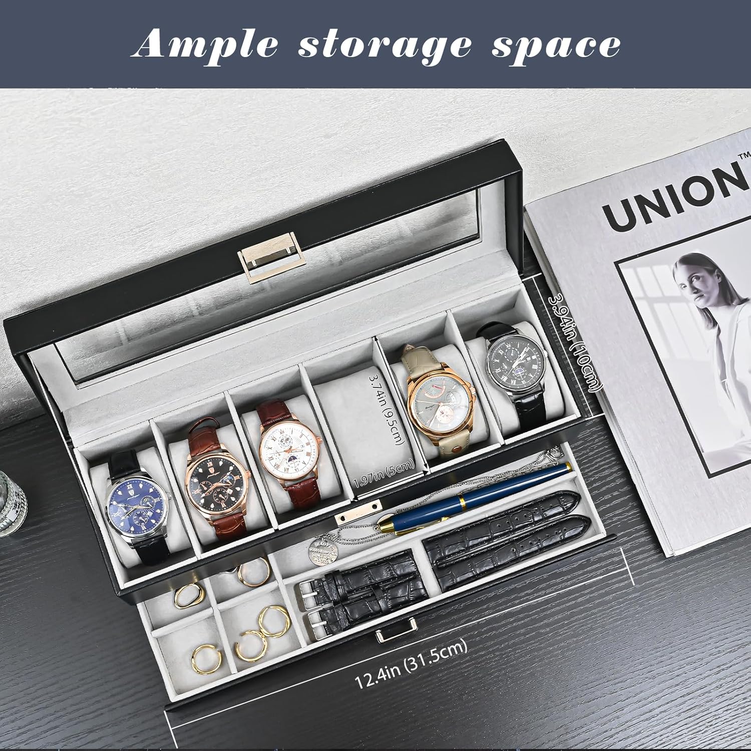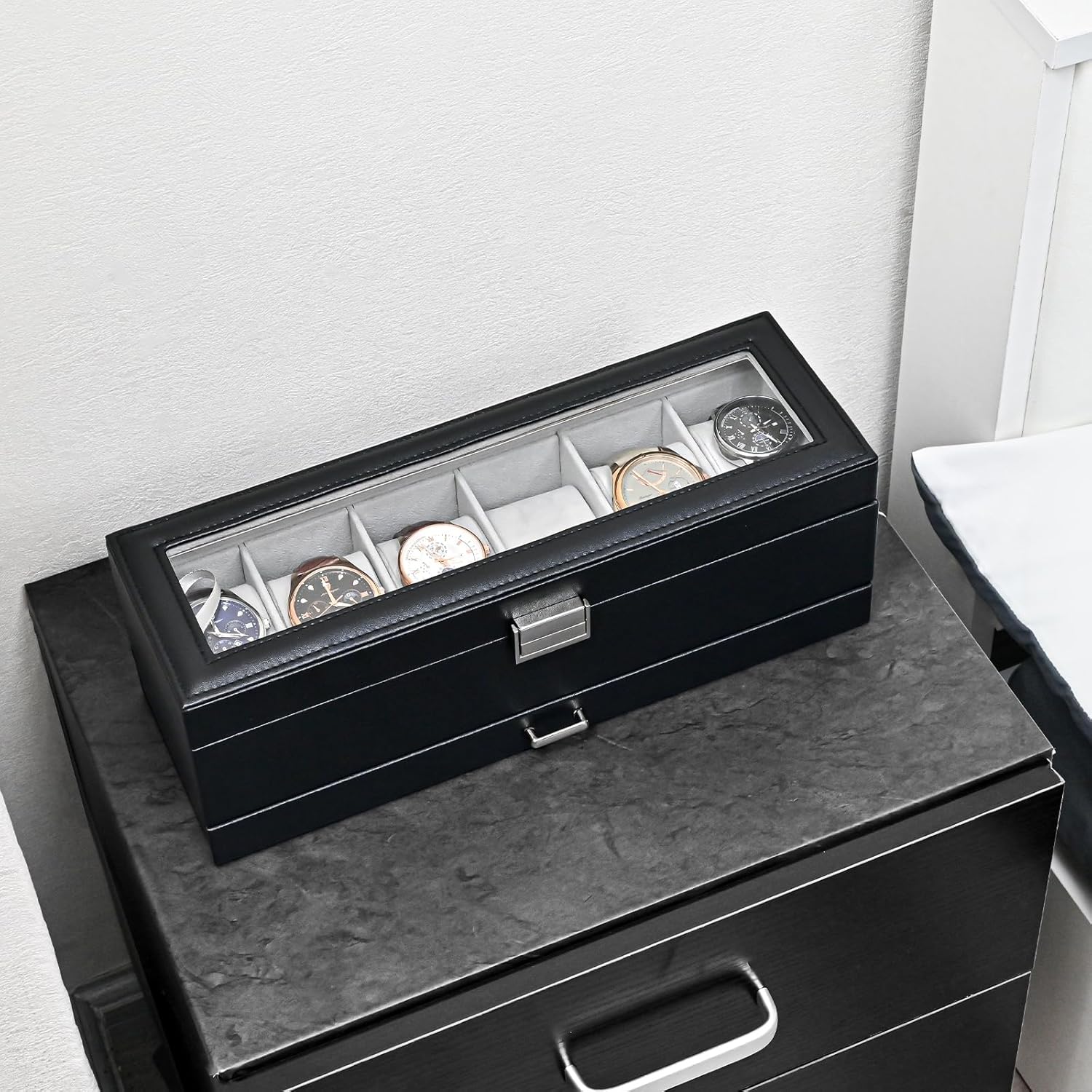 Estoy muy contenta con la compra. Es el tamaño perfecto (6 ranuras) para tener mi marido los relojes organizados sin que ocupe demasiado espacio.Detalles que me han gustado:​Tamaño ideal: Al ser para 6 relojes, es muy práctico y queda discreto en cualquier mueble. El cierre cierra con un clic firme, lo que da mucha seguridad.​Protección: Las almohadillas son suaves y encajan bien, manteniendo los relojes seguros y sin riesgo de rayaduras.​Visibilidad: La tapa de cristal es resistente y permite ver el interior perfectamente, lo cual queda muy decorativo.​Se nota de buena calidad y los acabados están muy cuidados. ¡Relación calidad-precio excelente!