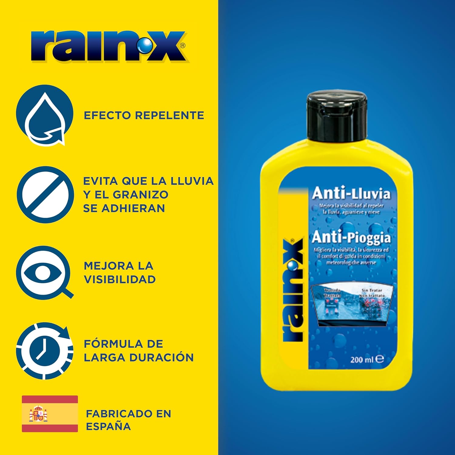 Este producto lo probé hace muchos años, cuando salió al mercado he iba francamente bien. Después durante otros años, he estado usando otra marca con idéntico resultado. Muchos años después he vuelto a comprar Rain-X por la comodidad de Amazon esperándome el mismo o mejor resultado que su sustituto temporal y me llevo la sorpresa de que no dura igual que antes ni repele el agua con tanta facilidad… A 90 km/h o 120 km/h antiguamente el agua se iba muy rápido, resbalan las gotas de agua muy rápido, ahora… Si resbalan, pero no deja un campo de visión tan bueno como antes y el efecto… Se va un antes y las gotas no se van con tanta facilidad a 90 km/h ni a 120 km/h.He de decir que tengo amplios conocimientos del cuidado del automóvil en general, tengo el parabrisas nuevo, a mayores pulido con polvo de cerio fino para mejorar su eficacia y aplico el repelente con el cristal totalmente limpio y seco, bien limpio, lo aplico generosamente en circulos superpuestos y lo dejo secar bien y lo retiro con una bayeta mojada para no dejar restos. Y aún asÃ… Eso, hace su función, repele y resbala el agua, pero no con la rapidez y facilidad con la que lo hacÃa Rain-X en sus comienzos, ni desde luego como el Grojet que estuve usando estos años. Por ello que cuando lo acabe… Volveré a Grojet o a cualquier otro que mejore al actual Rain-X.El dicho de coge «fama y échate a dormir…» Pues no es literalmente asà en este caso, pero si bajaron la calidad claramente. Aunque, parte positiva es que el precio no es malo y es fácil de encontrar, otros como Grojet se consiguen pero hay portes a mayores normalmente…Lo dicho, Rain-X es regulero, ya no es puntero en esto. El que busque algo top, toca irse a otras marcas.Los comentarios de que dura unos dÃas, deja alos etc. Ni caso, no lo saben o no lo están aplicando bien. Si se aplica sobre un cristal que no esté perfectamente limpio, seco y si no se aplica abundantemente frotando bien en cÃrculos, circulos superpuestos, se deja secar perfectamente y luego no se retira con una bayeta empapada bien… Pues lógicamente, no se consigue el efecto que garantiza la marca… Vamos que si queremos que funcione hay que aplicarlo como se debe… 2+2=4 y a los que sumar 1+2 y que les de 4 aplicándolo mal… asà no funciona.