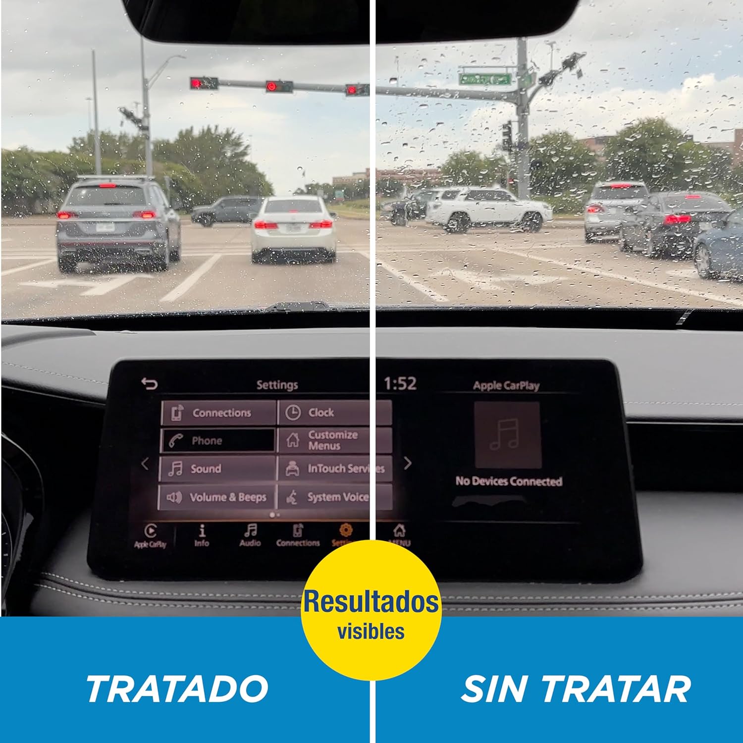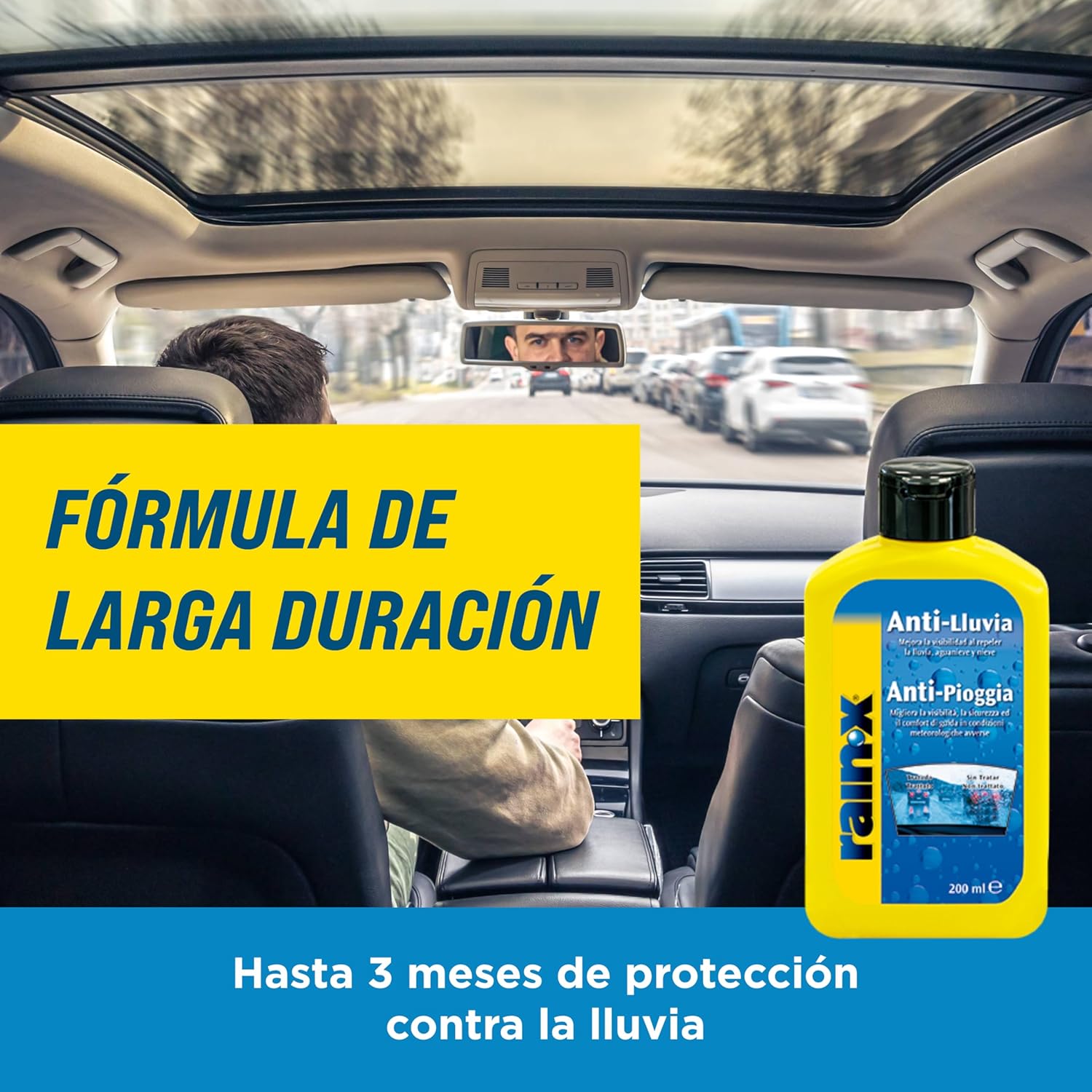 Deja el cristal limpio y con efecto repelente inmediato. A partir de 80 km/h el agua simplemente resbala. También útil en espejos o mamparas. Pequeño frasco, grandes resultados.
