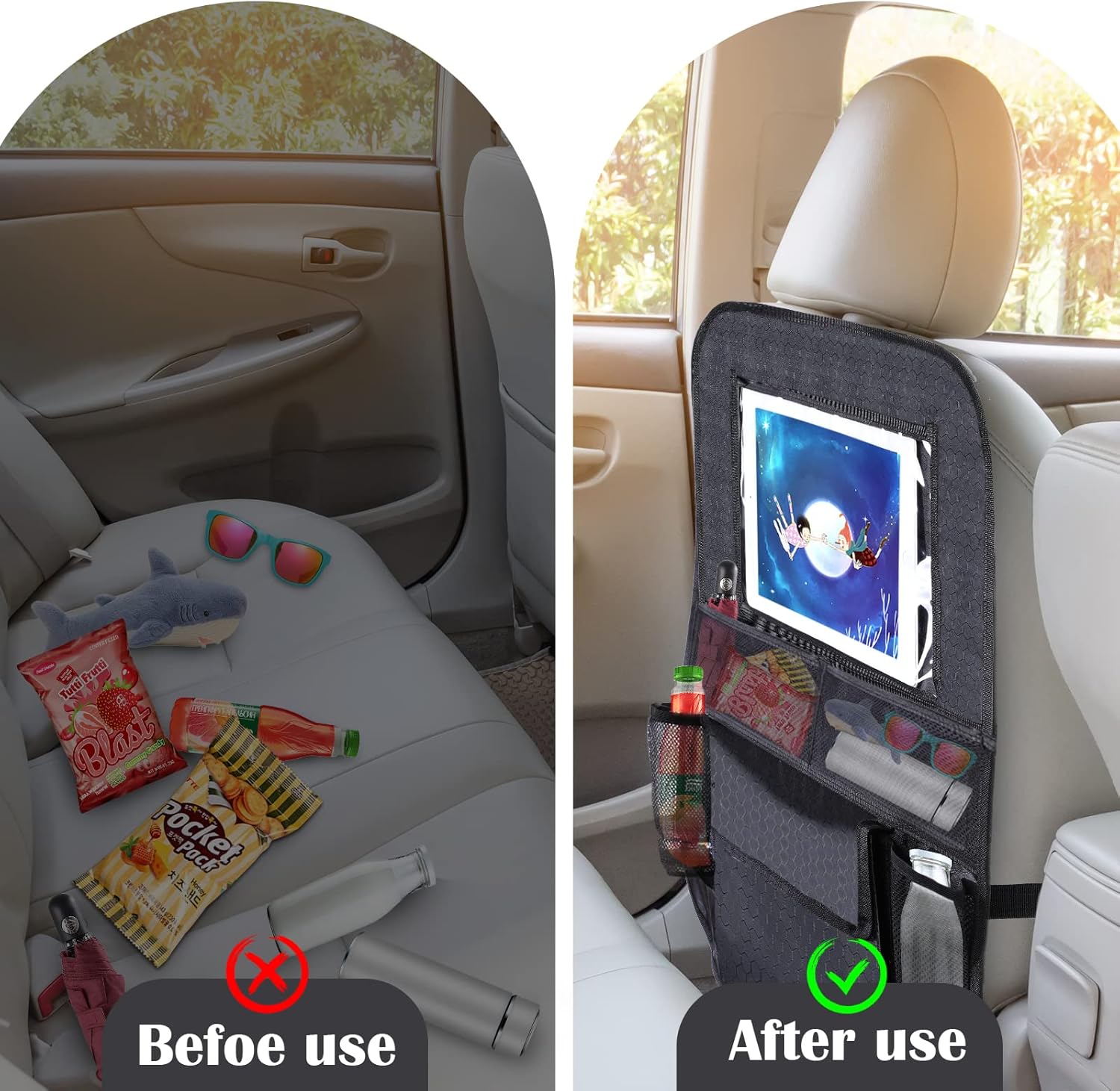 Practical and easy to install: It fits most cars and is very easy to install. Our car seat back organizer has an adjustable buckle to prevent it from falling off. The adjustable straps are very suitable for most cars and SUVs and can be attached or removed very quickly from the front seats.The car seat back organizer is perfect for cars, VW buses, motorhomes, caravans, strollers.