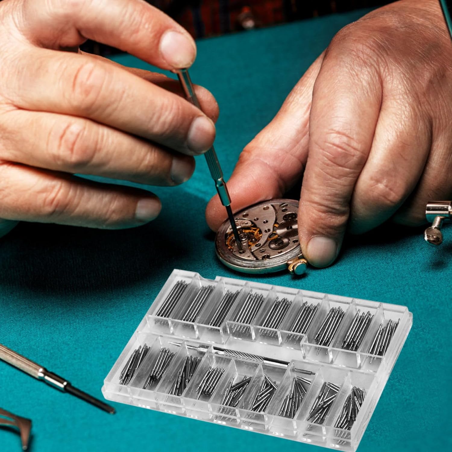 All watch pins and tools are sorted and stored in one box.