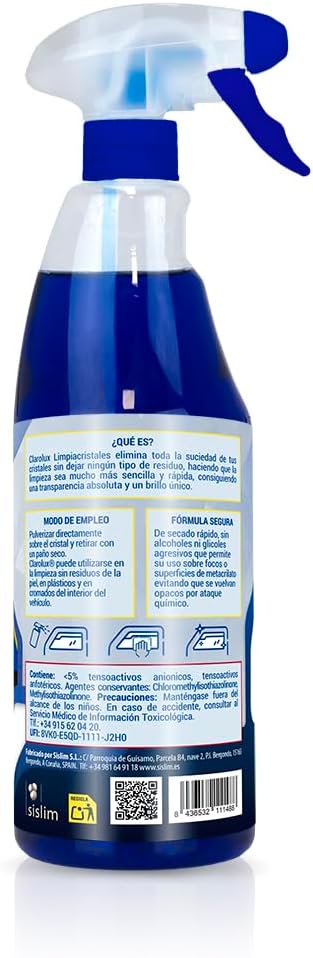 Maniático de la limpieza del coche, el producto, todavÃa no he llegado a encontrar algo como un buen amoniaco, el clarolux, hace su función y limpia bien, pero no aguanta tanto el paso de los dÃas, y ahora que empieza el otoño con la humedad enseguida tiene que estar poniendo el AC porque se empaña, yo no lo volverÃa a comprar, se lo di a mi madre para los cristales de casa.