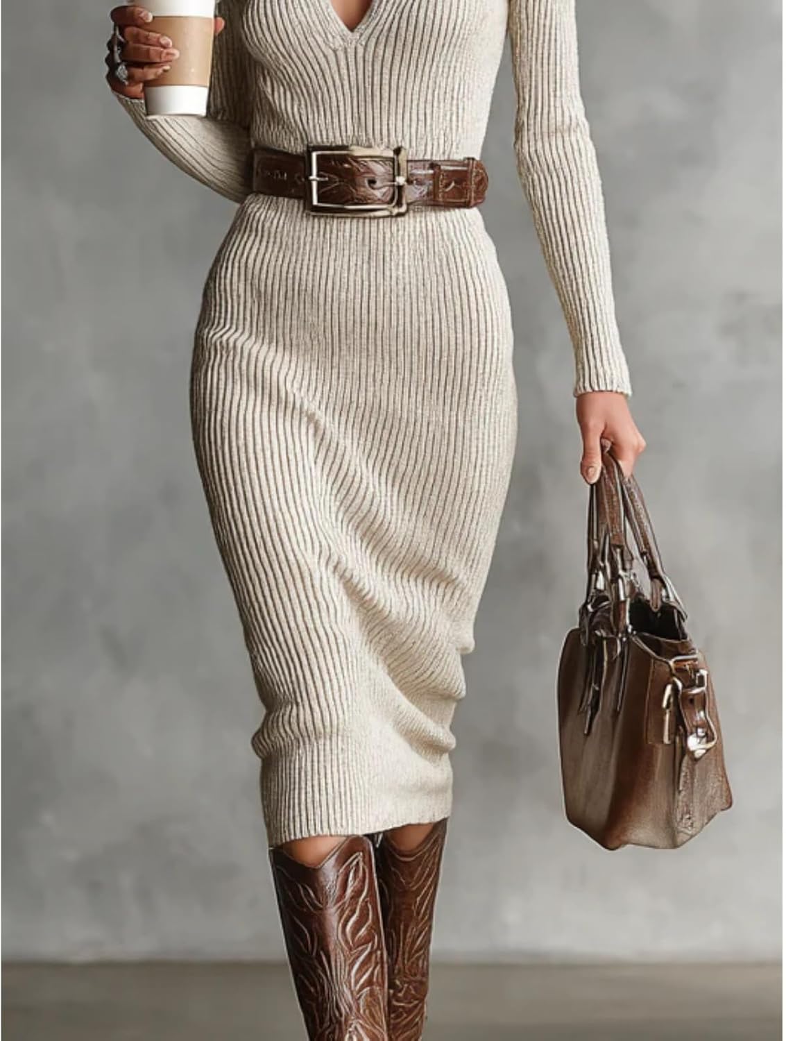 A flattering knit midi dress designed with a fitted silhouette, elegant turtleneck with v-neck detail, long sleeves, and a removable belt that highlights the waist. Perfect for everyday chic looks or sophisticated occasions.