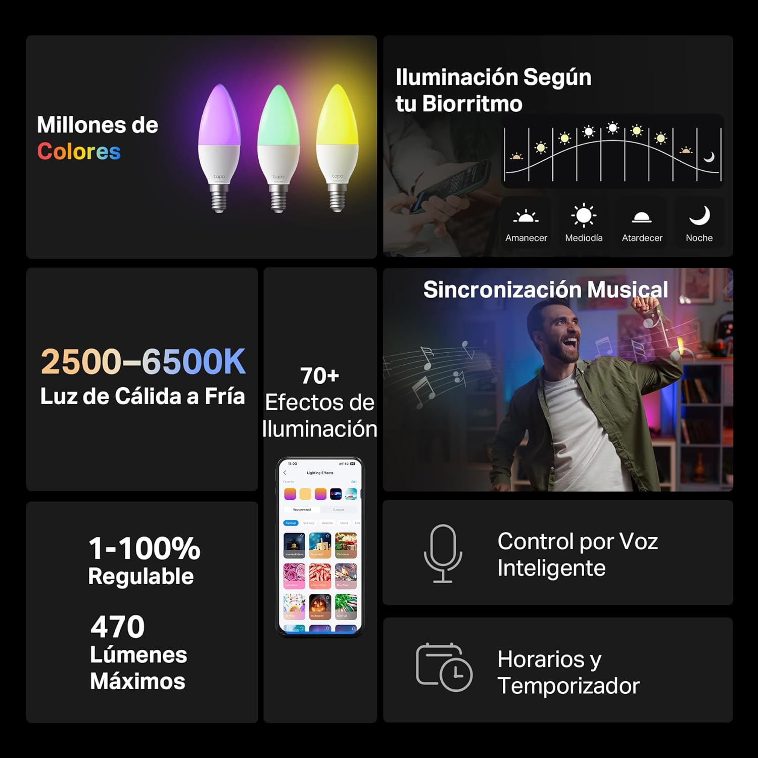 Ajusta tus luces a blanco cálido (2500K) para dormir, o a blanco frío (6500K) para trabajar o leer.