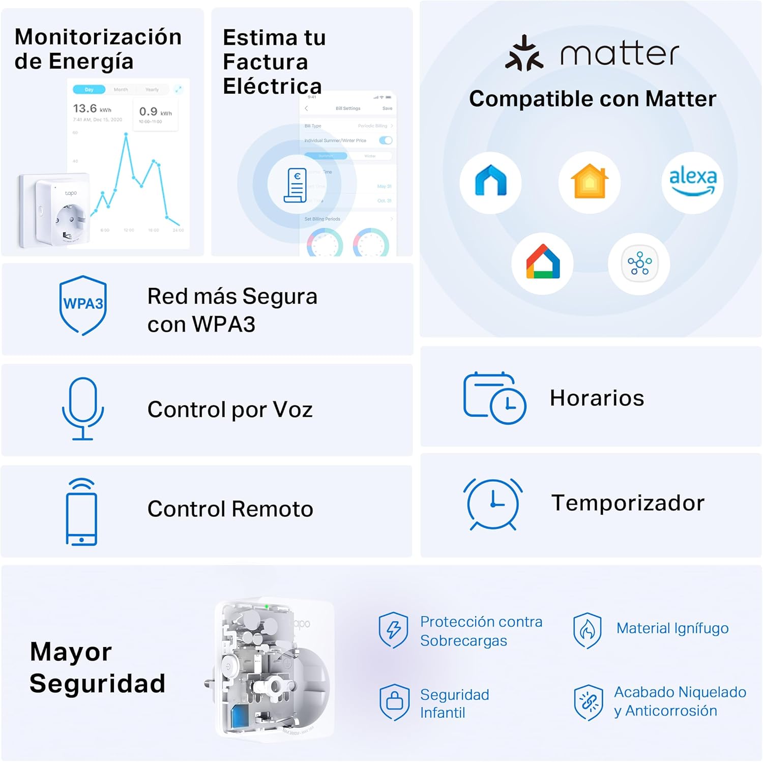 Me voy a centrar en las novedades y diferencias técnicas respecto de otros enchufes inteligentes o el modelo anterior de Tapo (el P110 sin M), al fin y al cabo decir que sirve para controlarlo de forma remota o que es compatible con Google Home o Alexa no aporta nada porque eso lo hace cualquier enchufe inteligente del mercado.Lo tengo añadido tanto a la app de Tapo como a Google Home, en este último mediante Matter (esta es la M del P110M) por el gusto de prescindir de la nube de Tapo, en la práctica a mucha gente le dará igual. Con Apple Home por ejemplo solo puede añadirse mediante Matter, el modelo anterior en Apple Home no funcionaba.Mi uso es una pequeña estufa auxiliar que como mucho la uso dos o tres horas seguidas y me interesaba que tuviera el mayor número posible de protecciones en local para evitar accidentes incluso si no pudiera controlarlo remotamente o fallaran las automatizaciones. Este tiene auto-apagado (sin depender de Internet), limitador de potencia y estado predeterminado configurable.== PROS ==- Es WiFi (no necesita hub) y soporta WPA3, el estándar más reciente de seguridad WiFi.- Compatible con prácticamente cualquier plataforma domótica, bien con integraciones en la nube o locales con Matter: Google Home, Alexa, SmartThings, IFTTT, Home Assistant, Apple Home, etc.- Si lo usas con Matter para encender/apagar no tienes ni que instalar la app de Tapo o registrarte en Tapo, solo escanear un código QR. Pero al final vas a instalar la app, aunque sea por la actualización de firmware.- Medidor de consumo que Tapo ha mejorado recientemente y ofrece datos en tiempo real cada 5 segundos además de guardar el histórico y poder descargarlo.- Relé de 16A, soporta hasta 3680W, puedes conectar casi cualquier cosa.- Limitador de potencia, puedes configurar que si el aparato que conectes consume más de X vatios se apague.- Auto-off, puede configurarse que el enchufe se apague de forma automática (sin depender de la WiFi o Internet) en cierto tiempo tras el encendido. Para mà es la medida de seguridad estrella.- Estado predeterminado tras corte de luz, puedes elegir si volverá a estado encendido, apagado o como estuviera antes.- La luz de estado puede configurarse para que de noche se apague, todo un detalle si lo usas en el dormitorio.== CONTRAS ==- El diseño bloque rectangular es antiguo y ya «no se lleva», se supone que van a sacar el P115M que ese es compacto de verdad.- El precio de salida (19.90€) solo se justifica si necesitas Matter o el auto-off, de lo contrario tienes el P110 en oferta muchas veces por menos, o el P115 que es más bonito.- Por Matter no puede consultarse el consumo energético, no es culpa de Tapo sino del estándar Matter que todavÃa no incluye esa caracterÃstica. Para eso hay que usar la app de Tapo y tener una cuenta de Tapo (es la misma de TP-Link o Kasa, por cierto).- Es Matter over WiFi, no Matter over Thread, ya ahà cada uno que valore cómo va a hacer crecer su ecosistema domótico. En Apple Home quizá tiene más sentido comprar productos con Thread en vez de WiFi, pero los enchufes que hay con Thread ahora son escasos y caros.- El consumo en reposo es superior a 1W, algo habitual en enchufes WiFi. Esto lo comento porque hay gente que pone enchufes inteligentes para evitar el consumo en reposo de otros dispositivos y es muy posible que el enchufe les esté gastando más que lo que querÃan evitar :-)== CONCLUSIONES ==Por caracterÃsticas es, junto al Shelly Plus Plug S, de los enchufes inteligentes WiFi más completos que hay ahora mismo. Me hubiera gustado comprar el P115M que es más compacto pero no ha salido todavÃa y lo necesitaba ya.En mi caso tenÃa claro que lo querÃa con Matter para ahorrarme nubes o si algún dÃa cambio de ecosistema domótico. También ha influido pero menos que tengo una cámara y sensores de temperatura Tapo y asà no necesito otra app para ver el consumo del enchufe. HabrÃa sido un mal menor, en el dÃa a dÃa uso Google Home y sus automatizaciones asà que la app de Tapo realmente no la uso mucho salvo para configurarlo.