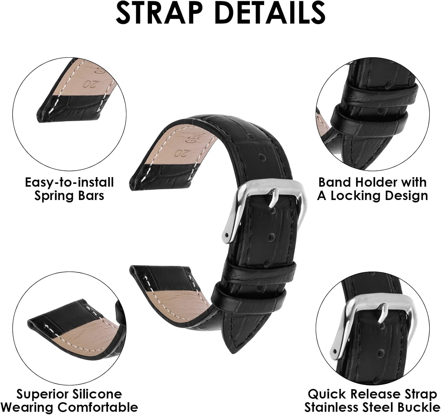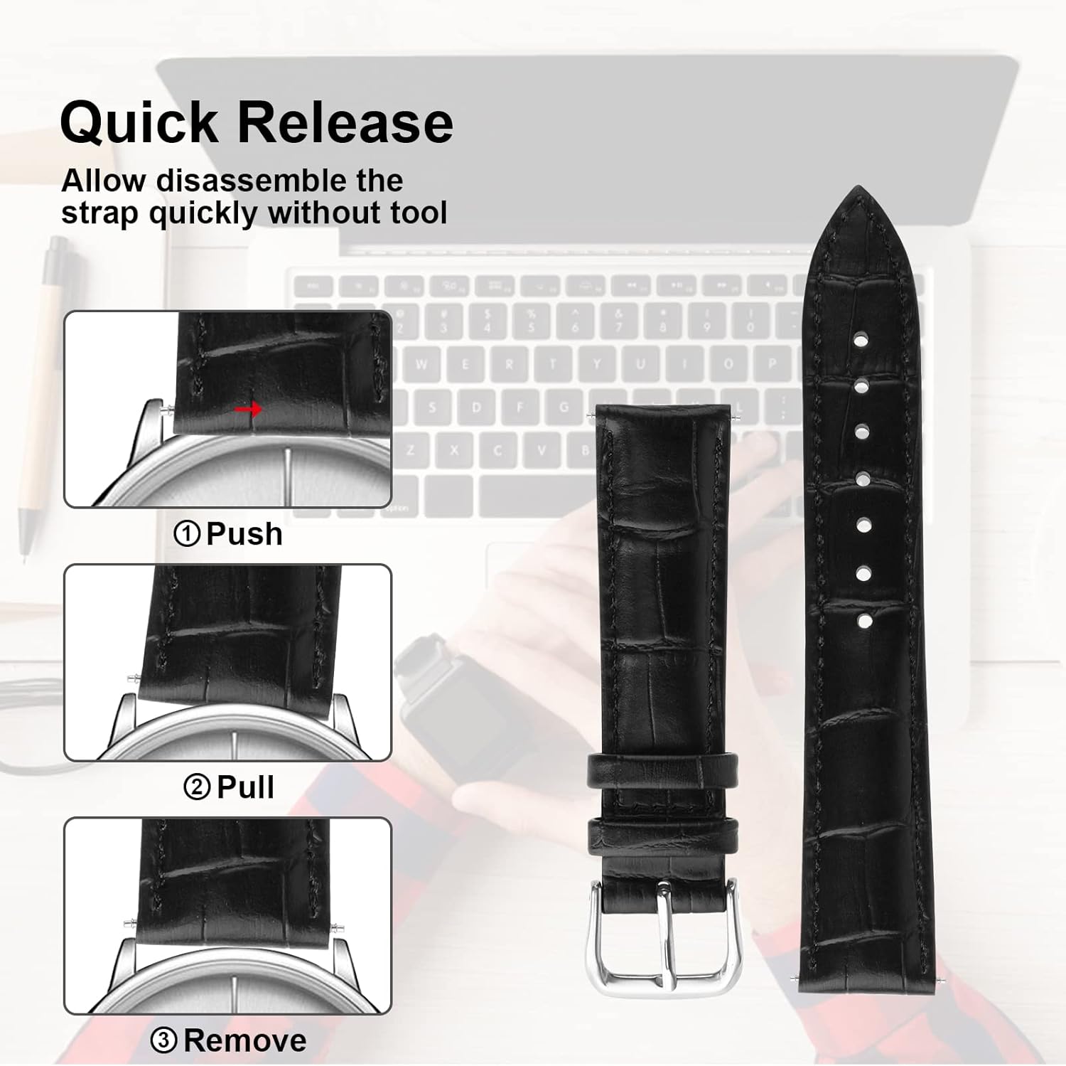 TIESOME watch strap leather calfskin crocodile grain replacement stainless steel strap buckle bracelet for men women
