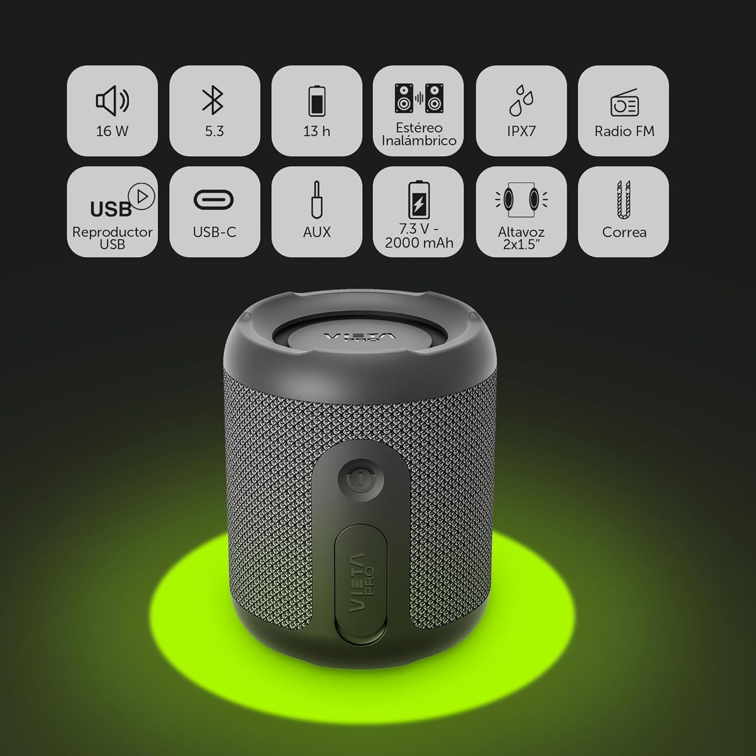 13 valoraciones en Vieta Pro | Powerful 5.3 Bluetooth Speaker with FM Radio, IPX7 Waterproof, 13H Battery, Microphone, Aux-In, USB-C, TWS | Sun Autoamplified Portable Speaker Compatible with Alexa Google and Siri