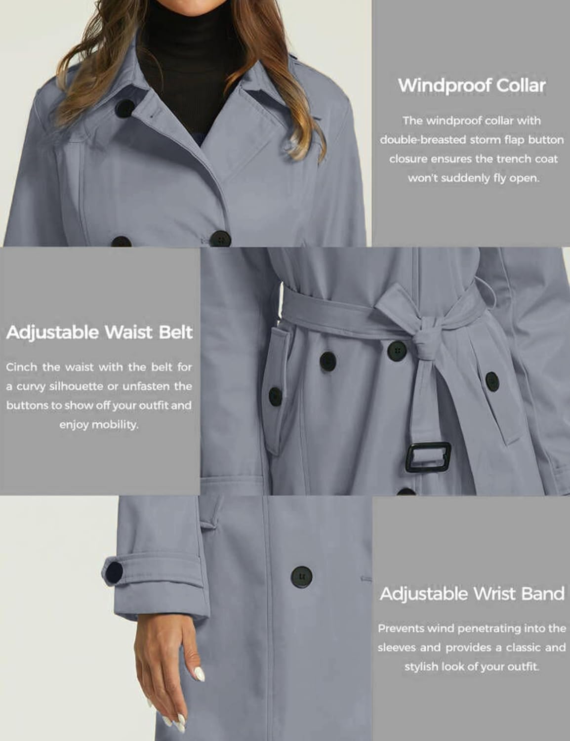 Très beau trench bien imperméable, la coupe est droite non ceintrée, le tissu est bien épais et cette veste est doublé, j’ai l’ai pris et noir et une taille au dessus pour être à l’aise avec des pulls en dessous. A porter ouvert ou fermé, très classe.En effet la ceinture est un peu trop longue de 5 cm au moinsTrès bon achat.