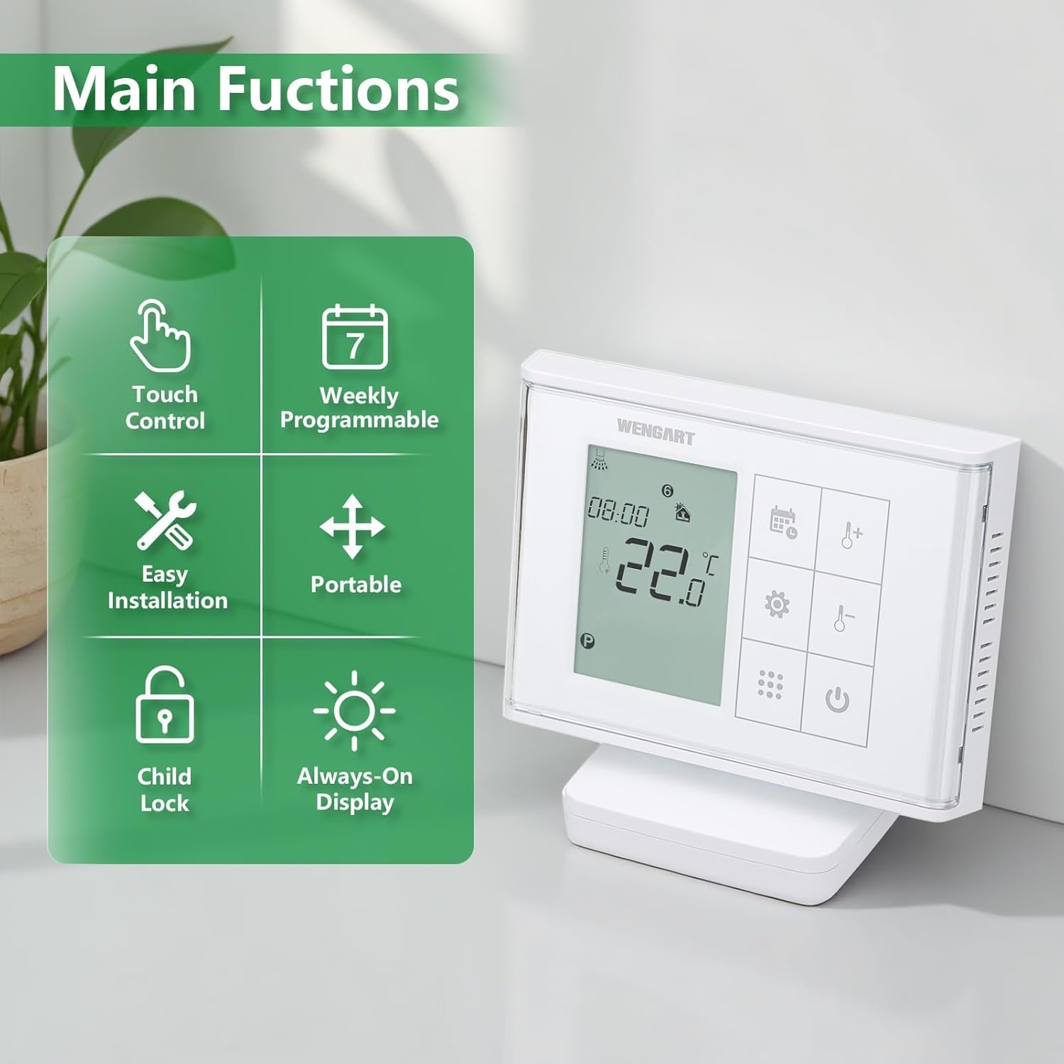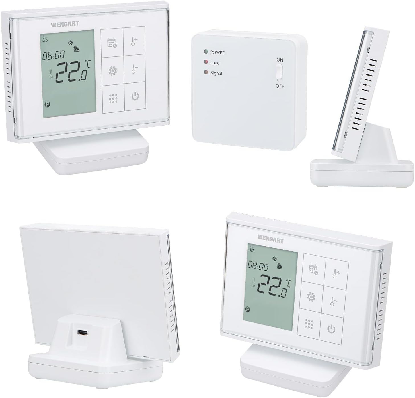 Wengart WG010RF Wireless Thermostat, Battery Operated and Receiver, Weekly Programming, No Wiring, Compatible with Underfloor Heating/Boiler