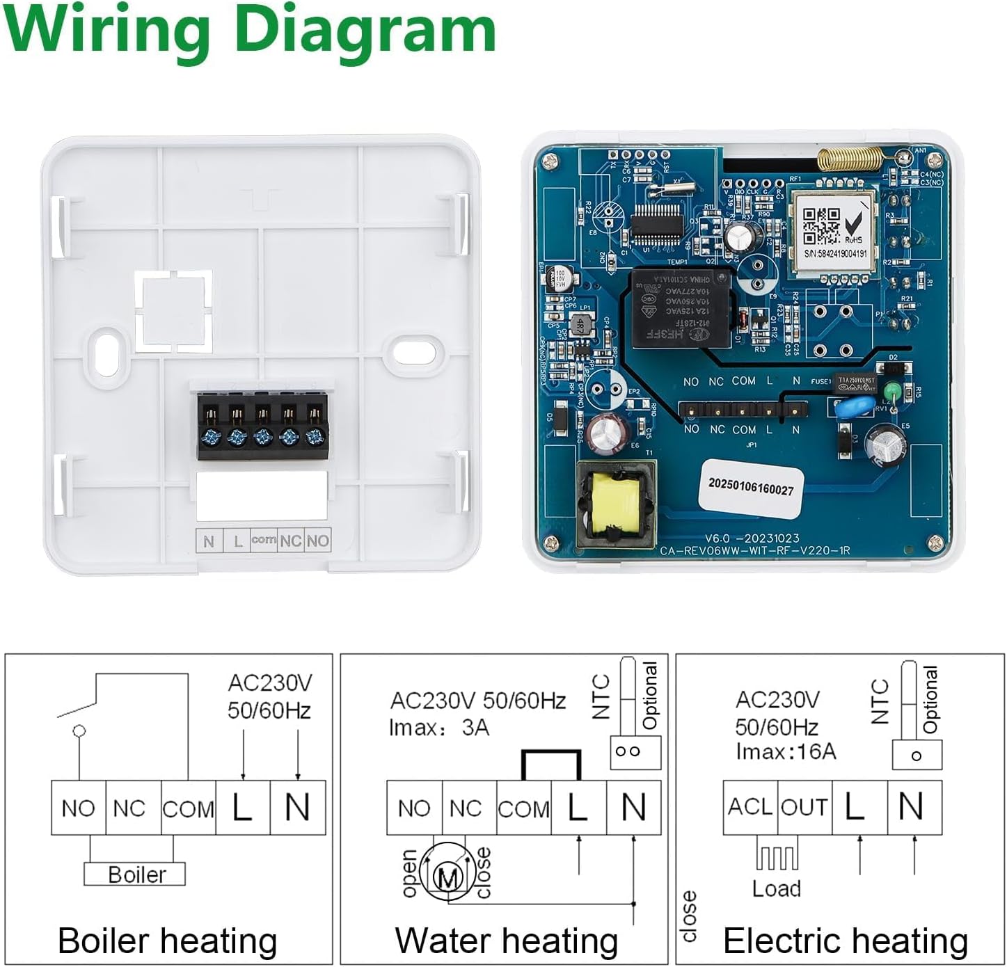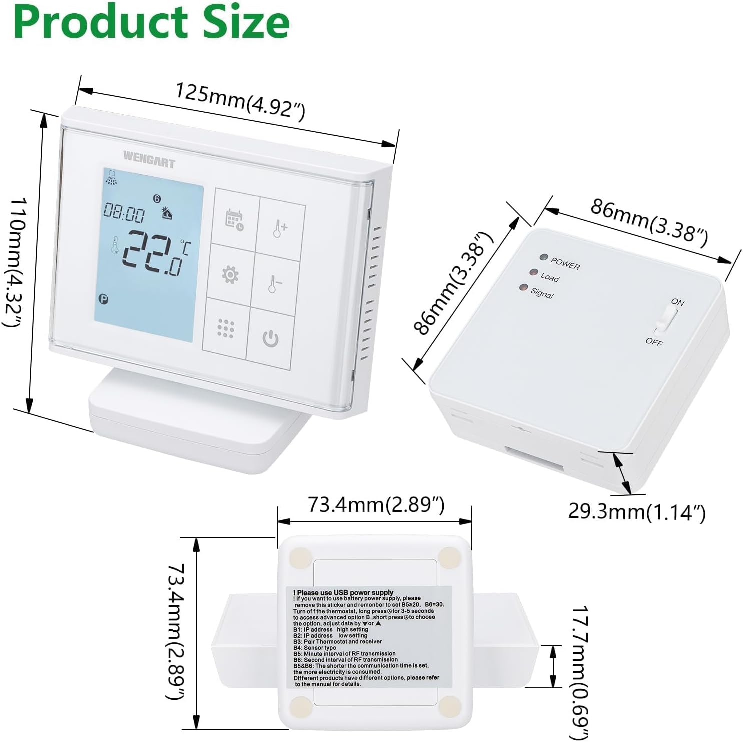 Our wireless thermostat uses RF technology for stable and reliable signal. It requires no wiring or damage to walls and installs in as little as 10 minutes, allowing you to easily enjoy the convenience of smart heating. The product includes a receiver and a controller, which greatly simplifies the installation: simply attach the thermostat panel and connect the receiver to control the temperature wirelessly, just like a remote control. It is ideal for a variety of domestic and commercial environments. This thermostat features an LCD digital display and supports weekly programmable timers, allowing you to set the desired temperature for different time periods and achieve fully automatic operation. It also allows for manual adjustment at any time to suit your custom heating needs. Whether you wake up in the morning, leave home during the day or lie down at night, it automatically adjusts to your ideal temperature, saving you time and energy. As for compatibility, this thermostat is compatible with all underfloor heating systems and radiators, as well as major brands of gas boilers. Whether you live in a luxury apartment, villa, office or business, you can quickly upgrade your smart heating system and use it right out of the box, without requiring complex modifications. Its battery-powered design eliminates the need for wires, allowing you to place the thermostat where it’s most convenient for you, without worrying about the distance to the outlet. In addition, the radio frequency signal is transmitted stably, without being affected by the walls, which ensures accurate control of the operation of the heating system, optimizes energy efficiency and maintains a comfortable temperature in every room. From its easy installation and smart control functions to its stability and compatibility, this wireless thermostat meets all your needs, making heating smarter, more efficient and worry-free. Specifications: