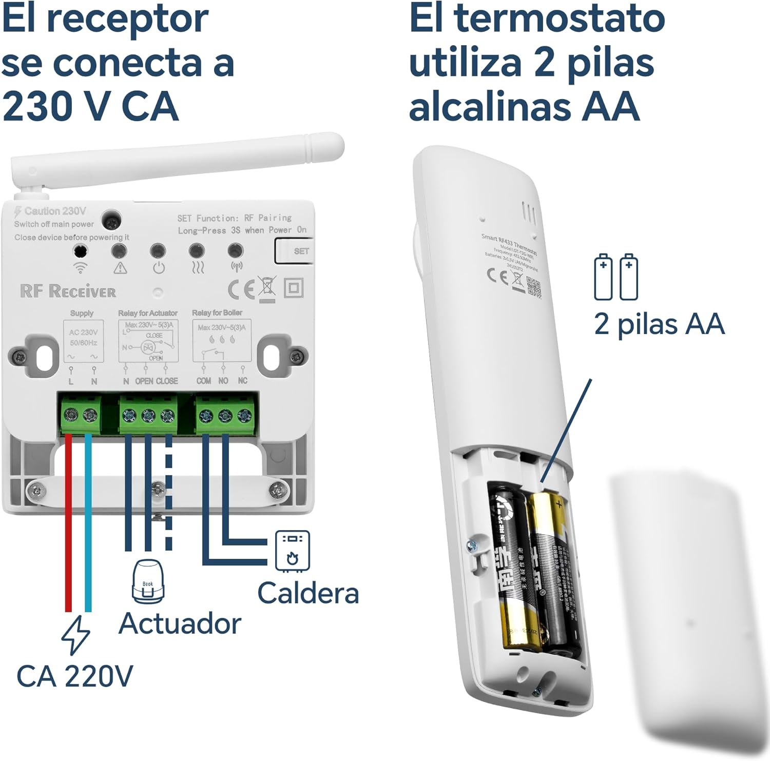 BATTERY THERMOSTAT: The thermostat is powered by two batteries; when the power level drops below 20%, a symbol appears to remind you to change the batteries. The receiver is powered by 220 volt current; you need to make sure there is current at the installation site before buying and installing it.