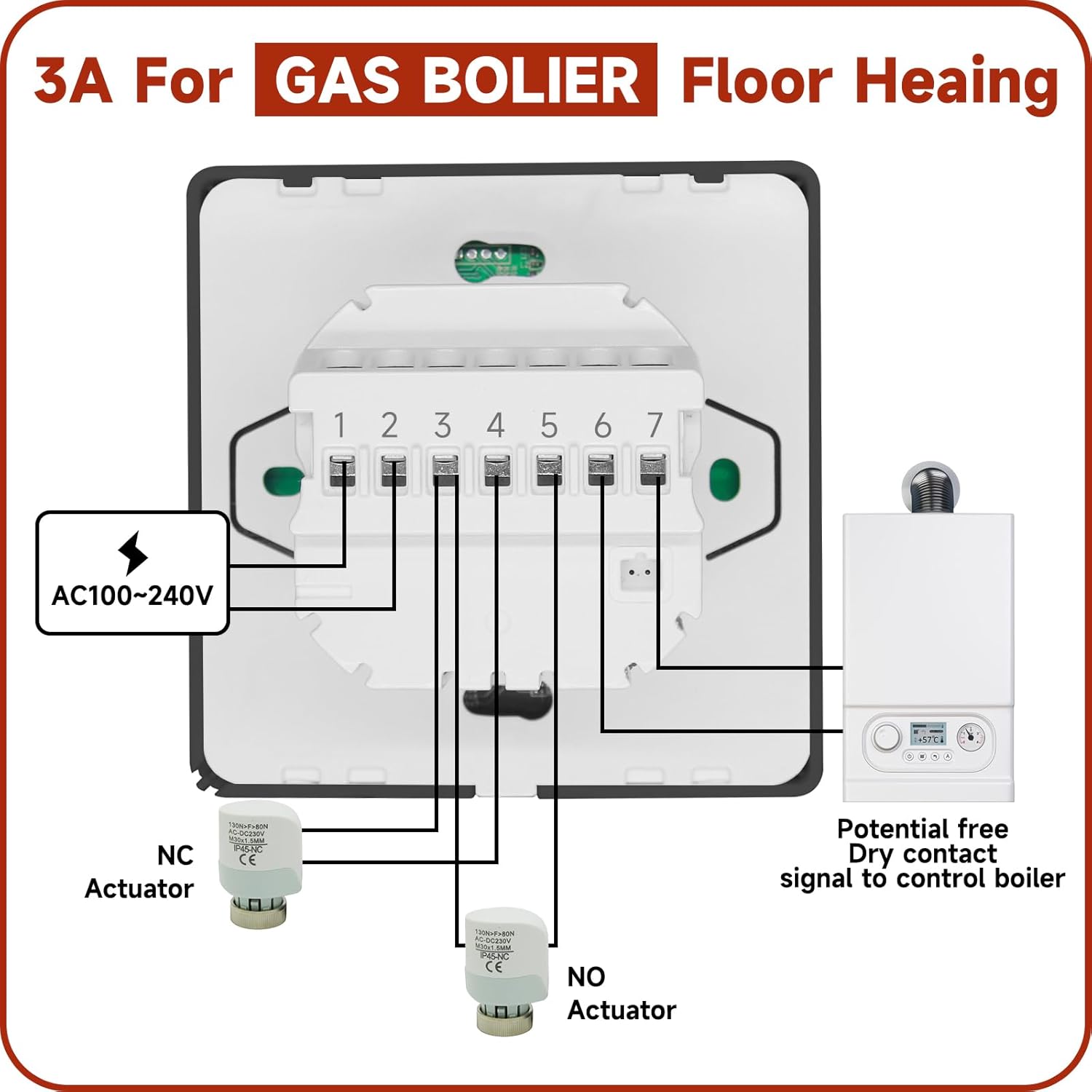Applicable to which equipment: This thermostat is suitable for boilers with dry contact connections, please make sure it is suitable for the appliance in your home when you select it.Voltage: AC 100~240V, 50~60Hz, charging current: 3A.