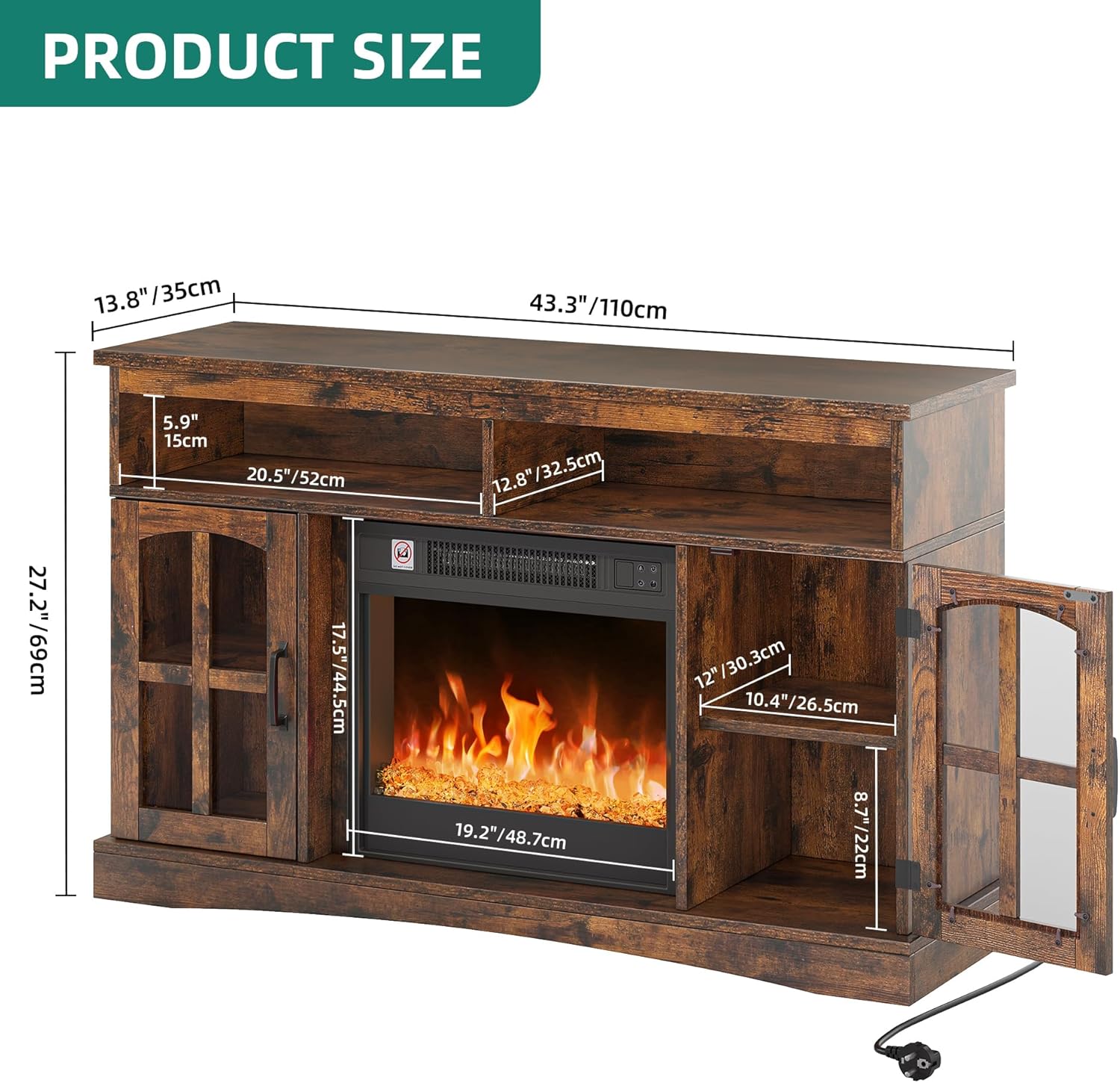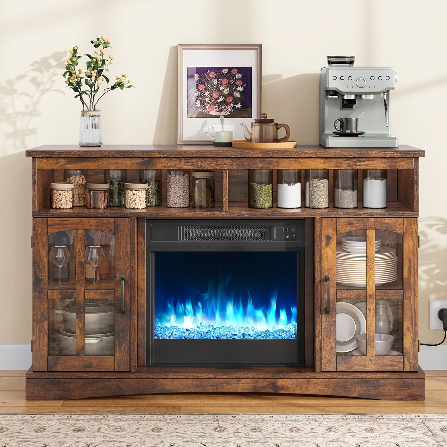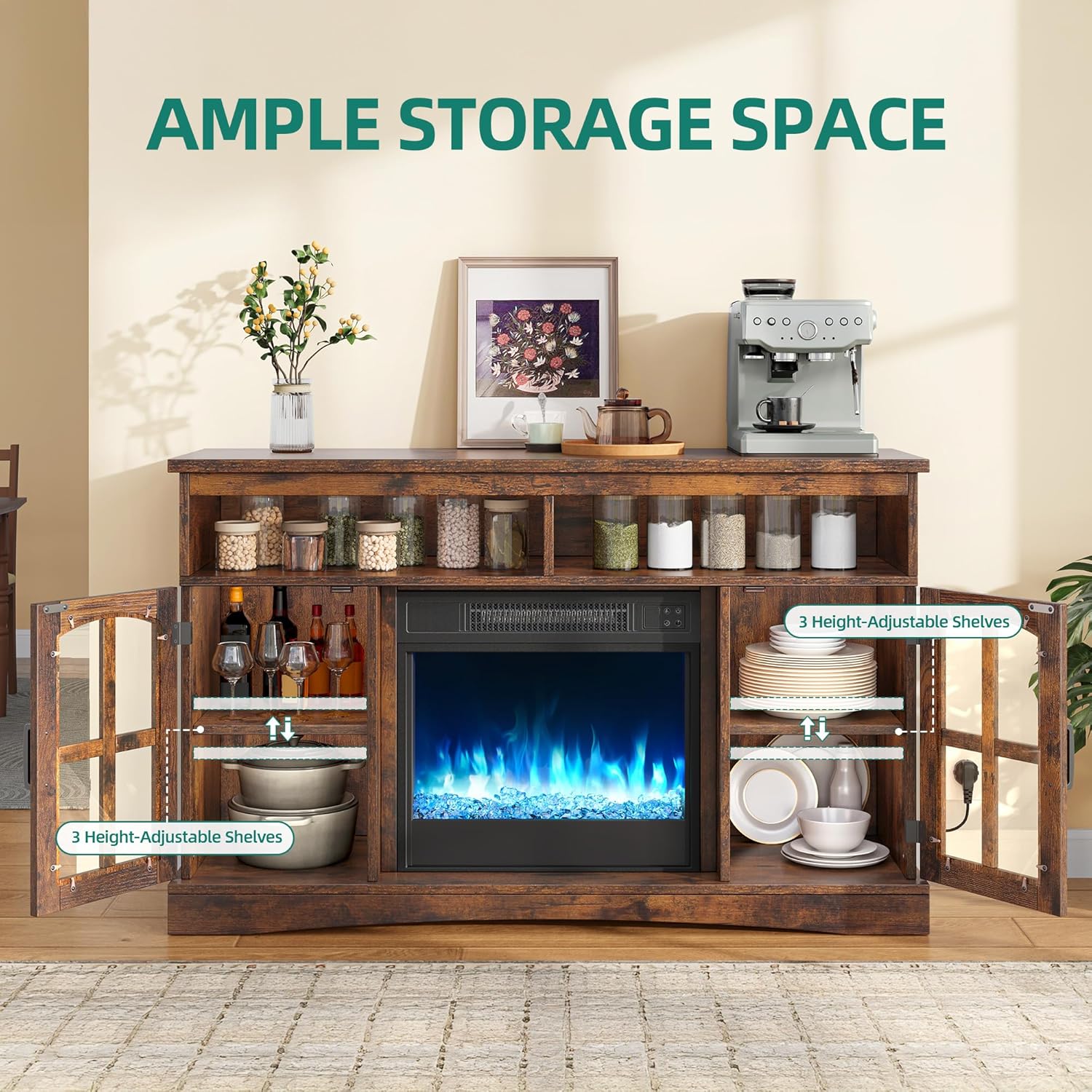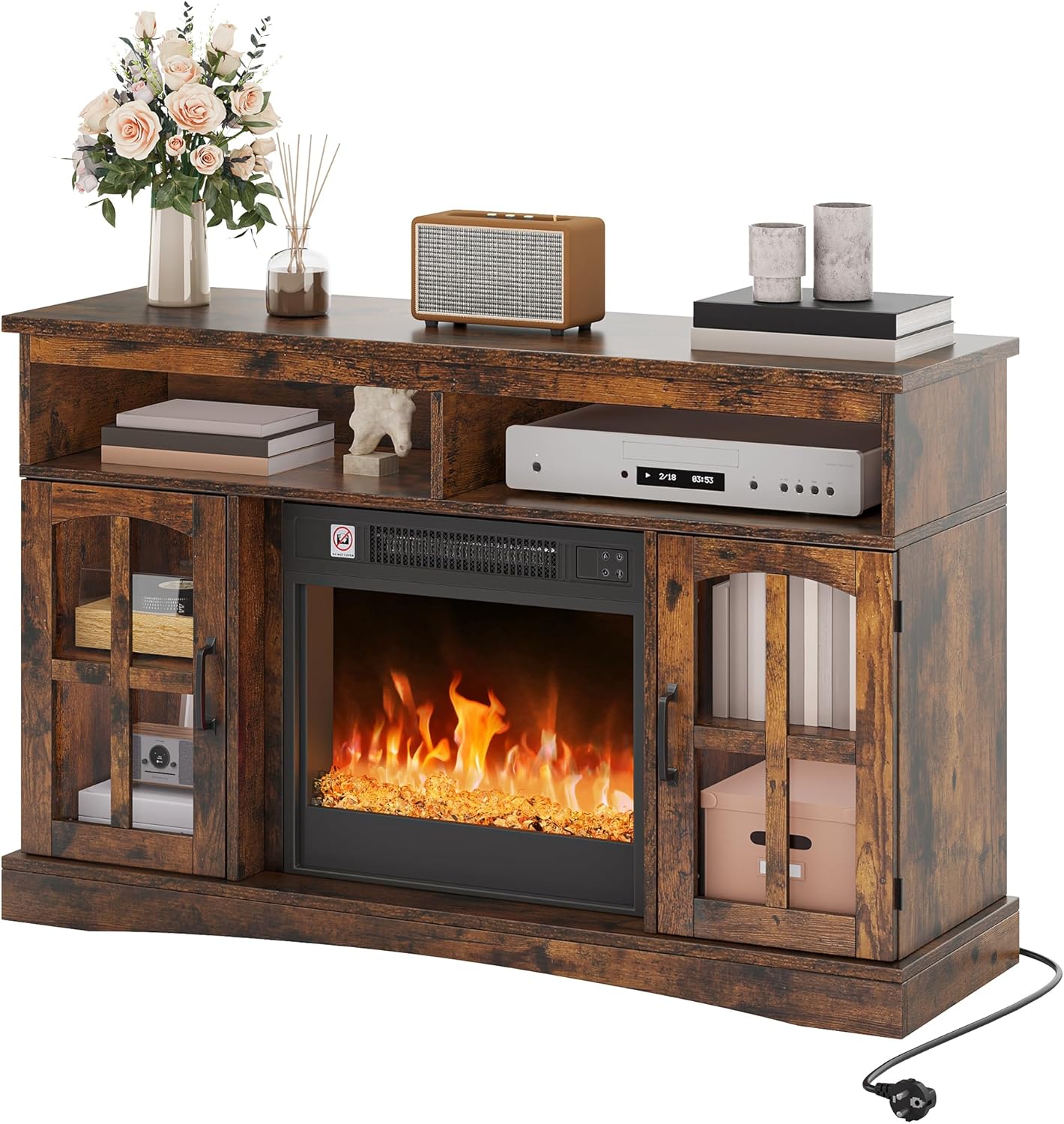 AMPLE STORAGE SPACE AND DISPLAY SURFACE: This electric fireplace offers convenient storage space through glass display cases, open compartments and a generous top. The versatile electric fireplace offers space for multimedia equipment, books and decorative objects, and keeps your spaces organized. Presenting your favorite pieces is easy with the thoughtfully designed electric fireplace with storage space and combines functionality with aesthetic demand.