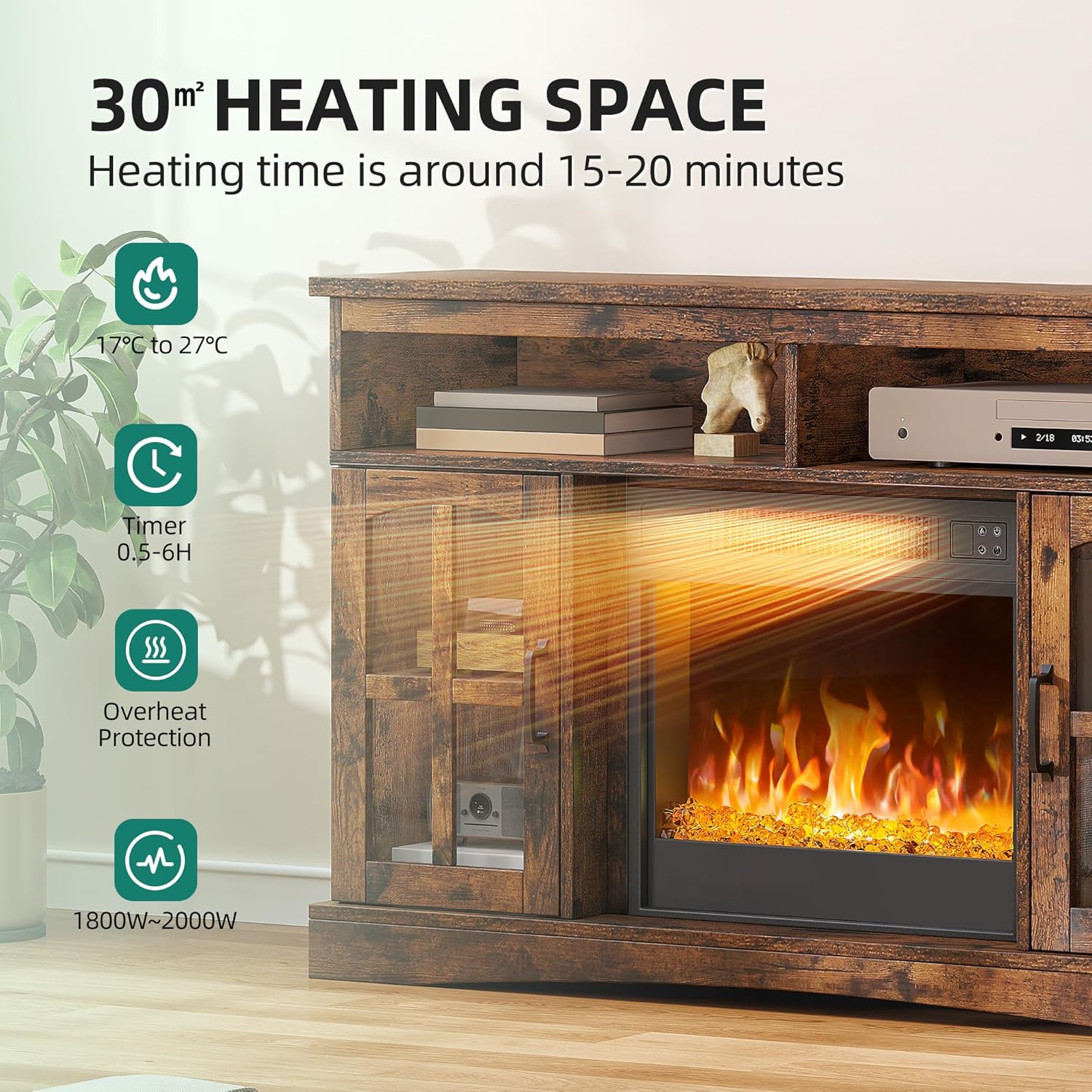 Product Summary: YITAHOME Electric Fireplace with Heating, Electric Fireplace for Living Room with Flame Effect, Adjustable Flame, 1-8 Hour Timer, Overheat Protection, Function